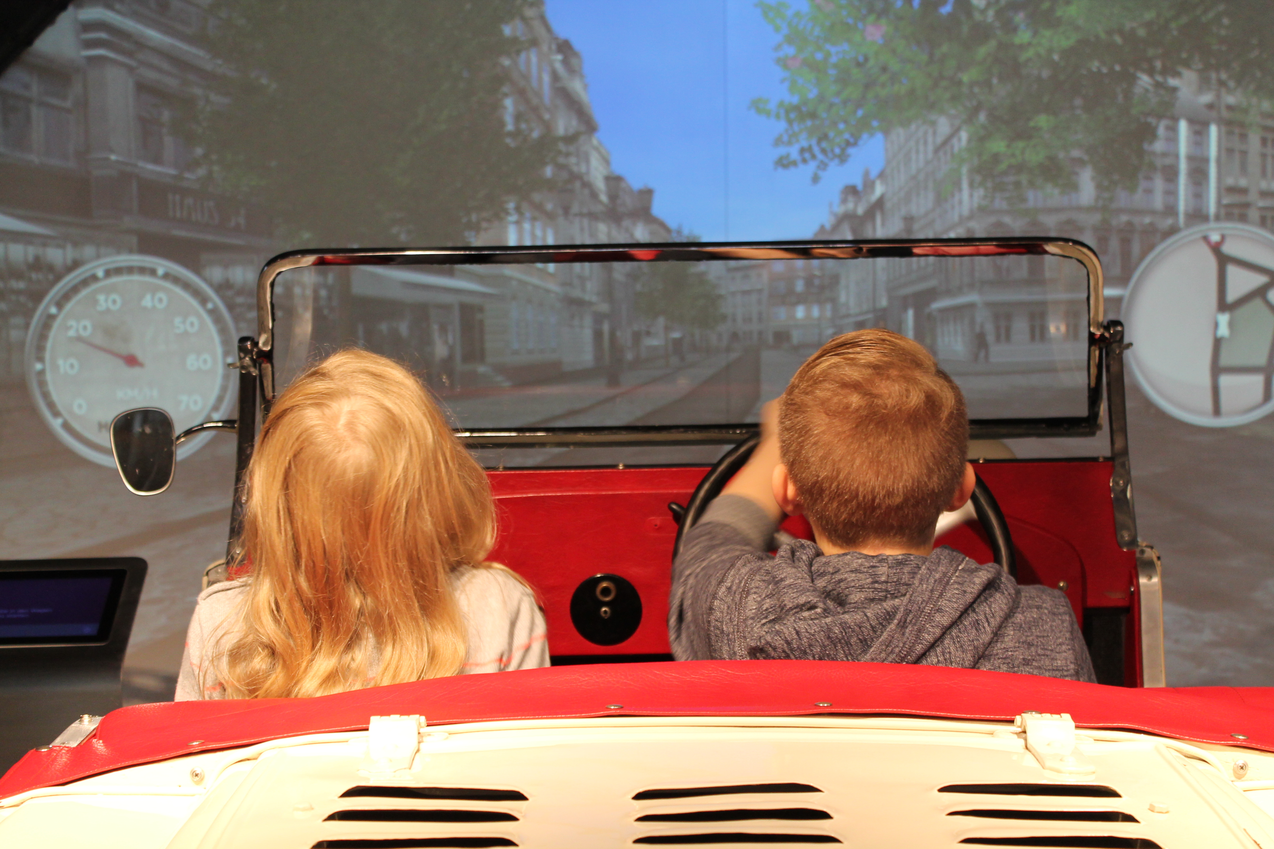 Ein Sonntagsausflug zunächst ganz im Sinne des Vaters. Die Geschichte der motorisierten Mobilität scheint doch eher ein Erwachsenen-Ding zu sein. Die Kinder selbst sind weniger voreingenommen und fahren ohne zu wissen was sie erwartet freudig mit. Der PS Speicher in Einbeck ist schnell gefunden und schon die Auffahrt zum Museums-Parkplatz birgt beeindruckende Momente. Geschichtsträchtige Fahrzeuge in verglasten Containern sorgen für das erste Aha-Erlebnis. Wir wollen mehr und eilen durch den Kassenbereich ins Museumsgebäude. Unsere Augen öffnen sich weit – der Architektur Mix aus Alt und Neu ist wunderbar anzuschauen und man erkennt auf den ersten Blick, dass hier viele Abenteuer auf uns warten. Das Erste folgt prompt – der Fahrstuhl, der uns auf die erste Museumsebene befördert entpuppt sich als möblierte Zeitmaschine. Hier erfahren wir sitzend im Ohrensessel in Ton und Bild was uns in den kommenden Stunden erwartet.