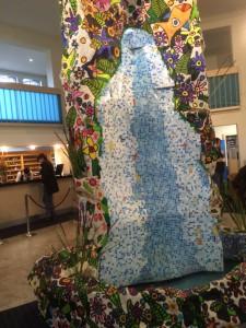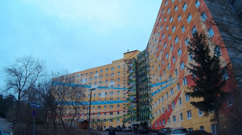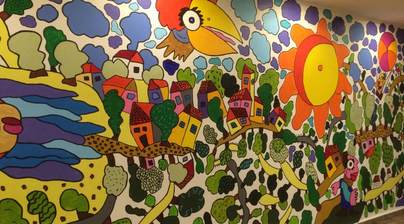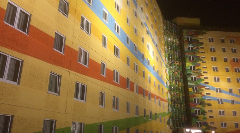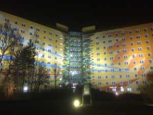 beeindruckende und einzigartige Landschaft zum Urlauben bietet. Leider ist es schon zu dunkel für eine Extrarunde durch Templin und so führt uns die sanfte Stimme aus dem Navigtionsgerät durch ein kleines Waldstück direkt zum Seehotel, welches sich vor uns mit seiner beeindruckenden und mächtigen Fassade unübersehbar auftut. Irgendwie erinnert die Szene an den Film „Titanic“ als die Passagiere den Ozeanriesen zum ersten Mal staunend im Hafen erblicken. Doch weit weg von den Gefahren des Nordatlantiks spinne ich diesen Gedanken nicht weiter und lasse mich stattdessen vom Motiv des größten Fassadenkunstwerks Europas in den Bann ziehen. Auf 12.435 qm erstrahlt das Werk des Künstlers Michael Fischer-Art über dem Urlaubs-Areal und stimmt uns auf ein erholsames Wochenende ein. Nachdem sich die Münder wieder geschlossen haben, wollen wir das Innere des Hotels entdecken. Die Empfangshalle mit ihrem paradiesisch anmutenden Brunnen und den