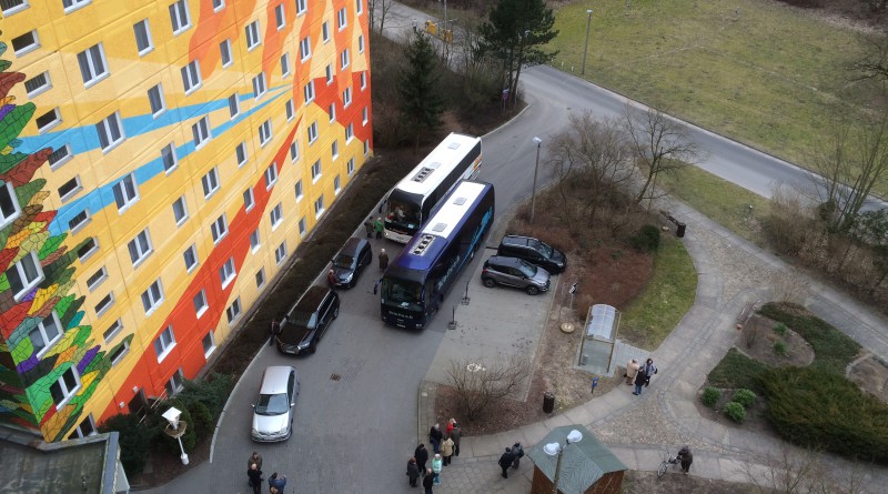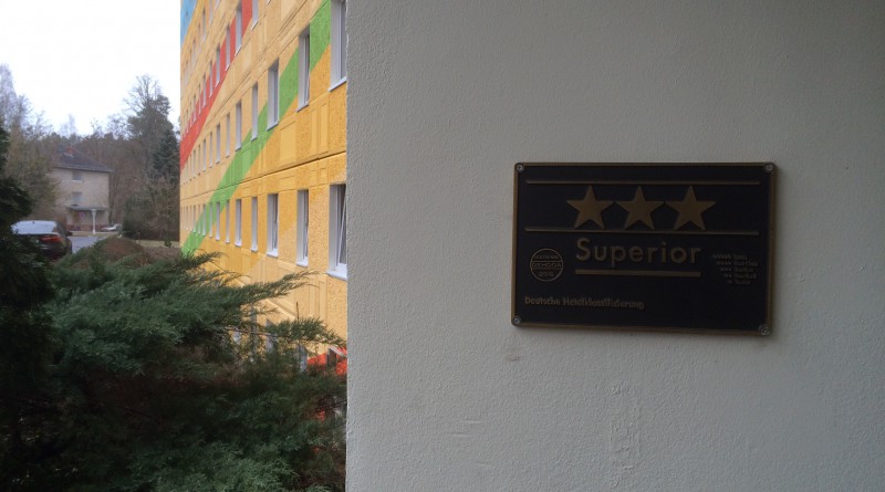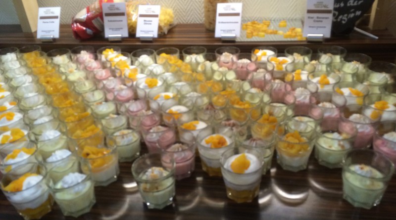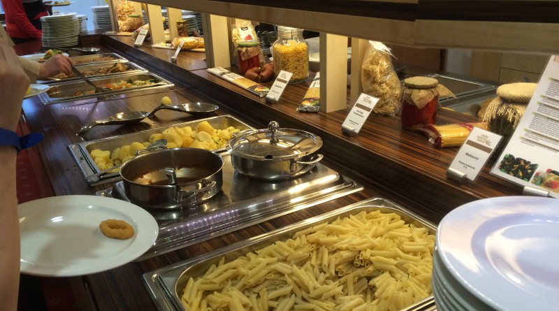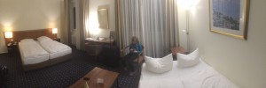 freundlichen Damen von der Rezeption verbreiten sofort gute Laune. Unsere Panorama-Suite liegt im 11ten Stock und ist eines von 409 Zimmern in Brandenburgs größtem Ferienhotel. Höher geht kaum – Die Einrichtung ist edel, die Sauberkeit offensichtlich. Hier werden wir uns für die nächsten zwei Tage prima erholen können. Da der Abend schon weit fortgeschritten und der Slot für das Büffet schon fast geschlossen, eilen wir in den Speisesaal. Nach kurzer Tischsuche können wir dann endlich unser Ankommen mit einem kühlen Getränk und einer großen