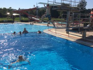Nichtstun und die Kinder drängen zu Recht darauf das anliegende Erlebnisbad zu besuchen. Somit wird der Aufbau des Rest-Lagers kurzerhand verschoben und wir geniessen die verbleibende Stunde vor Schliessung des Freibads in wortwörtlich vollen Zügen. Die gepflegte Schwimmanlage bietet alles was man an so einem Tag braucht. Kleinkinder-, Erlebnis-, Nichtschwimmer- und Schwimmerbecken, Rutsche, Strudel, Blubberbad, Volleyballfeld, Slackline, Piratenkiosk und schattige Plätze um nicht so ganz dem heissen Stern über uns ausgeliefert zu sein. Nach dieser Erfrischung zur Abendstunde knurren