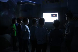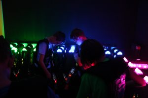 Am Tag des „Events“ stehen wir mit sechs tatendurstigen Teenagern am Empfangstresen von Lasersports. Die freundlichen Mitarbeiter führen uns durch die spacigen Räumlichkeiten. Unsere Warte-Lounge fühlt sich an wie die Brücke auf der Enterprise. Das Ambiente rockt schon mal! Nach wenigen Minuten geht es an die Einweisung und Erklärung des Spiels. Auf einem Monitor werden Verhaltensregeln und das Ziel des Spiels aufgezeigt. Im Grunde genommen ein futuristisches Räuber- und Gendarm Spiel im Konsolenstyle, bei dem man mit Sensorenwesten bekleidet nicht nur andere jagen muss, sondern auch noch Punkte durch Treffer auf bestimmte Zielpunkte in der Arena sammeln kann. Das Spielfeld selbst ist ein dunkles, mit