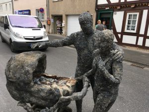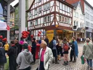 Am dritten Tag öffnen sich die Regenpforten erneut und jede Menge Nass ergiesst sich über das Festival-Gelände. Wir finden nach einem kurzen Gang durch die einmal pro Jahr sehr belebte Innenstadt wie jedes Jahr Platz in Helmuts-Hinterhof-Bar und treffen auf Moppel. Moppel ist ein Tausendsassa und Gesamtkunstwerk. Der bunte Hund vom Flair erzählt uns von ihrem gerade fertiggestellen Buch zum Thema Scheidung. Ein mega Konzept und Super-Thema nur noch leider ohne Verlag. Wer also wen kennt, der jemanden kennt! Zu den letzten Tönen von Pennywise wandeln wir an einem steineren Ehepaar (Walking-Act) und ihren entzückenden Babys vorbei zum Werdchen. Eine