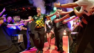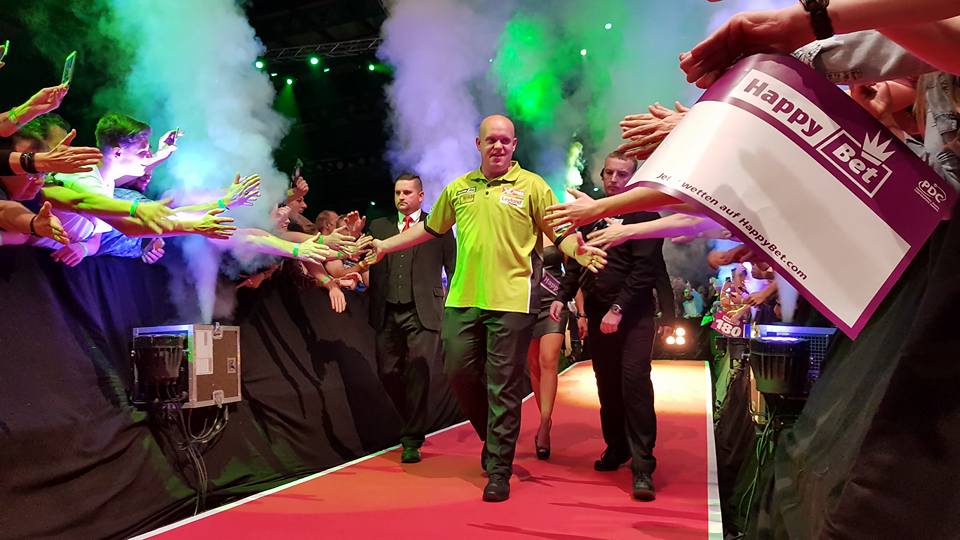 Im letzten Viertelfinale ist es dann soweit. ER, der absolute Superstar betritt die Bühne – Michael van Gerwen. Die unbestrittene Nr. 1 der Weltrangliste, Weltmeister der Jahre 2014 und 2017 und haushoher Favorit auf den Sieg in der Götti