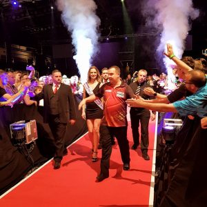 Fast 10 Jahre später schlendere ich mit meinem „Walk On Girl“ zur Göttinger Lokhalle, Darts endlich einmal hautnah live erleben. Wir haben Karten für die 6. Session, die Finalspiele. Als einer von 3524 Zuschauern, Rekord für die European Darts Trophy in Deutschland, gebe ich mich nach außen hin völlig cool, aber innerlich bin ich ziemlich aufgekratzt und die Hände sind feucht. Ich habe keine Ahnung was mich erwartet, schnell wird mir aber klar, dass ich inmitten einer riesigen Party mit Mario & Luigi, den Teletubbies und vielen anderen gelandet bin.