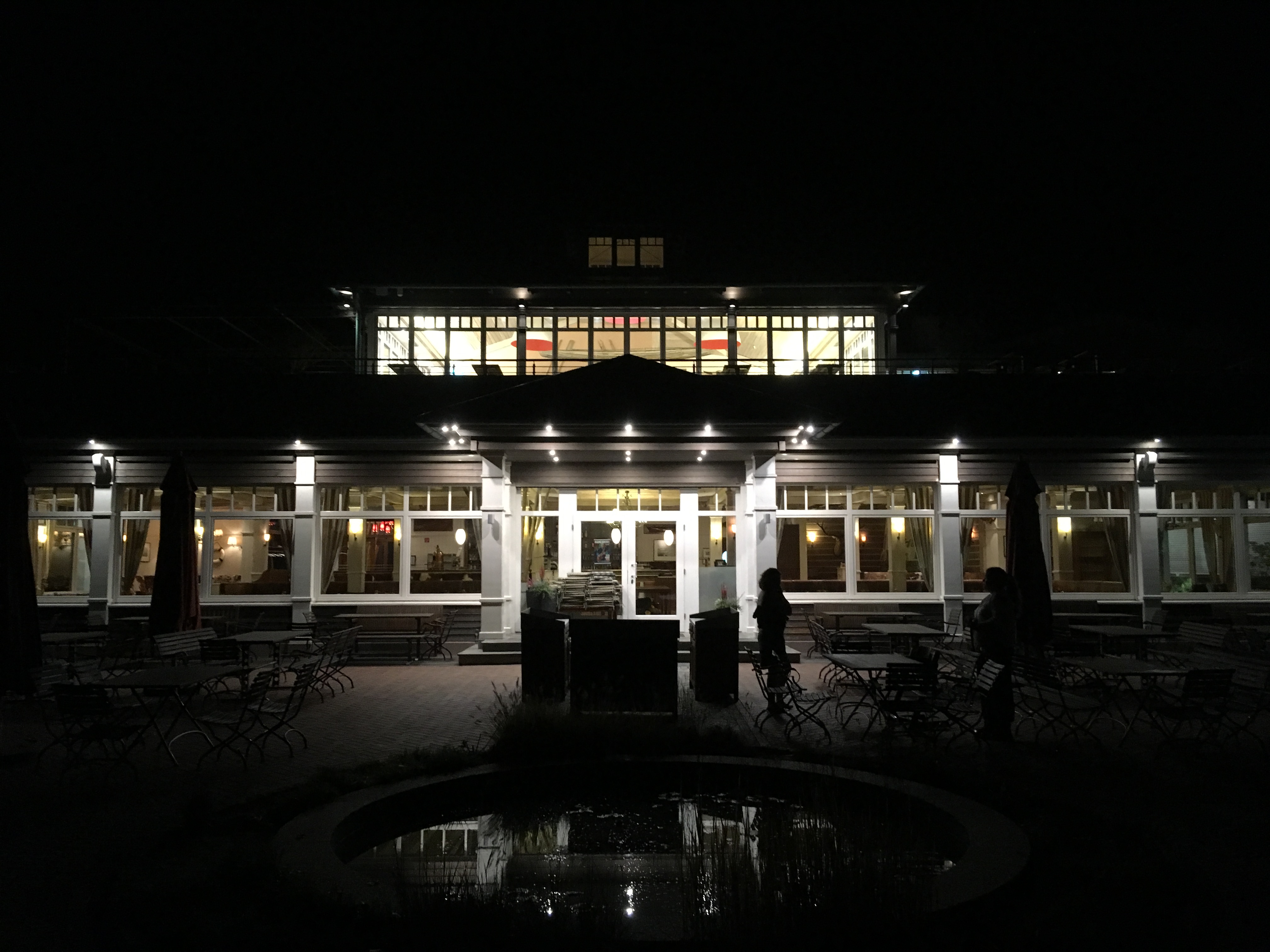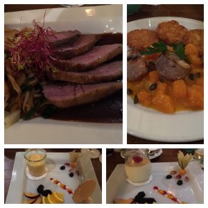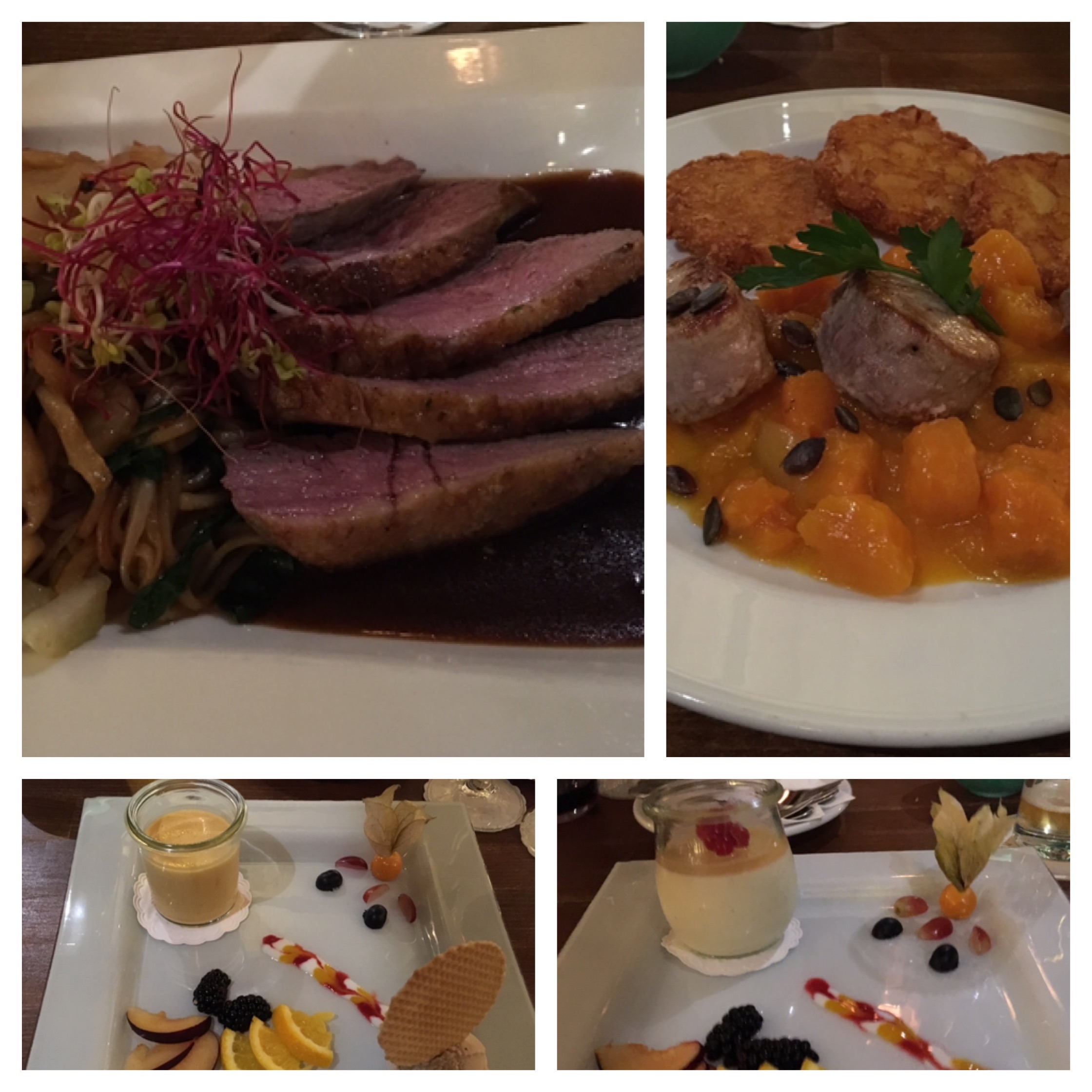 karte des Hauses. Eine Sammlung von lokalen und saisonalen Köstlichkeiten, lässt die Vorfreude steigen, erleichtert aber die Entscheidungsfindung nicht wirklich. Die Wahl fällt auf die Barberie Entenbrust und das Filet vom Landschwein an Kürbis. Das Arrangement des Gerichts ist ansprechend, der Geschmack äußerst exquisit und der Preis völlig in Ordnung. Zufriedener kann man eigentlich nicht sein, wenn da nicht die Dessertauswahl locken würde. Kürbis- und Holunderblüten-Panna Cotta soll uns in den lukullischen Himmel heben. Auf der Genuss-Wolke angekommen geniessen wir noch ein wenig das Flair dieses einzigartigen Restaurants und begeben uns dann für einen kleinen Spaziergang in der Dämmerung nach Draußen.