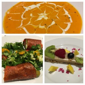 Wasser eingewiesen. Der Abend und somit das gebuchte Rohkost Menü rücken näher. Wir sind sehr gespannt was unsere Gaumen zu Kürbissuppe, Paprika-Wraps mit grünem Salat und Obstboden sagen werden. Schon die Optik der servierten Speisen macht Lust und wird der einfachen Beschreibung im Menü-Plan nicht gerecht. Liebevoll angerichtet und selbst zubereitet lassen wir uns das 3-Gang-Menü schmecken. Sowas leckeres haben wir in dieser Darreichungsform noch nie gegessen. Ein Geschmackserlebnis das Seinesgleichen sucht. Wir begeben uns nach einem Spaziergang unterhalb der nebelverhangenen Berge auf unser Zimmer und geniessen das aufkommende wohlige Gefühl im Innern. Kein Völlegefühl und der Gedanke seinem Körper etwas Gutes getan zu haben lassen uns in diesem gemütlichen Ambiente schnell zur Ruhe kommen.