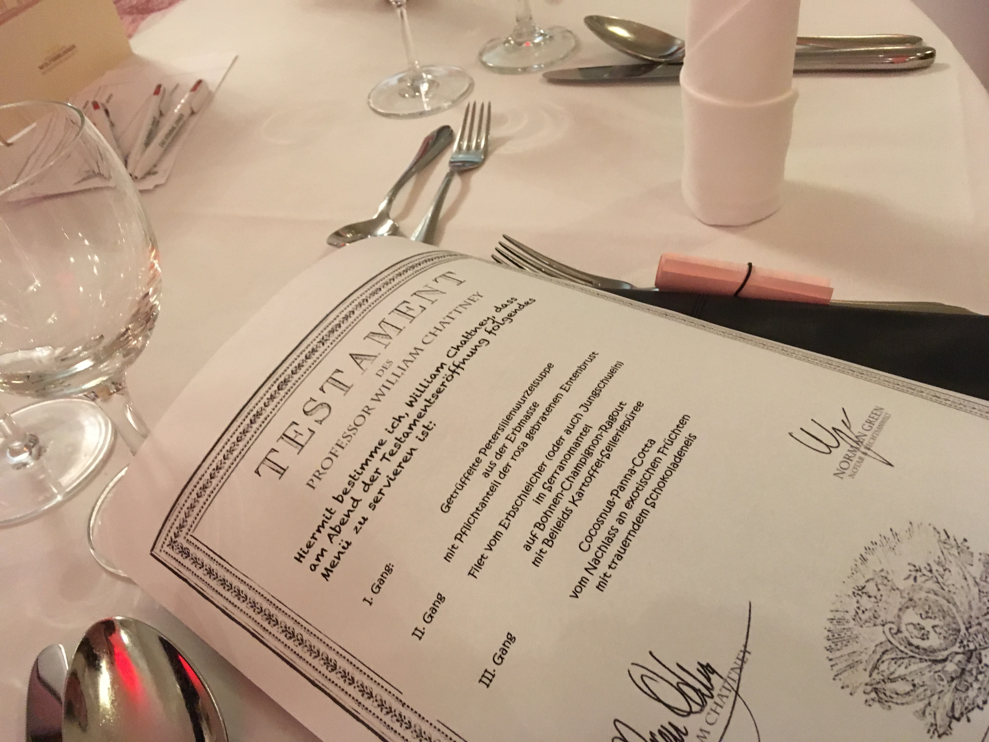 Der erste Akt von „Testament à la Carte“ beginnt mit einem Abriss über das Leben des Willliam Chattney. Das Publikum arbeitet intensiv mit. Die Schauspieler agieren sicher und mit der nötigen Selbstironie. Man ist nicht nur hier um zu schauen und zu essen, sondern auch um selbst zum Akteur zu werden. Es macht Spass in eine andere Rolle zu schlüpfen, sich mit anderen aus dem Publikum zu zanken, auszutauschen oder seinem Gegenüber weinend zu vergeben.