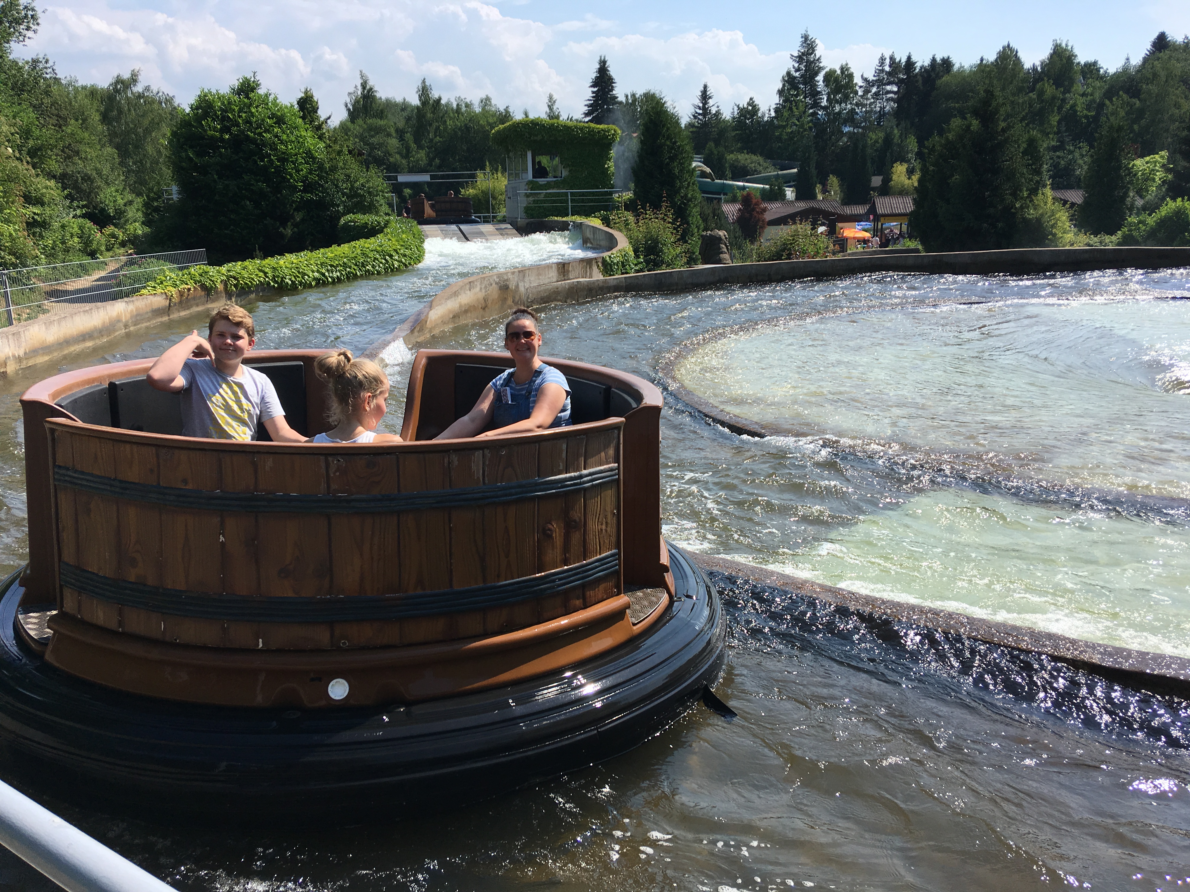 Wassersause helfen erstmal. Die Kinder wissen was sie wollen und lotsen uns zu einer Attraktion nach der anderen. Riesen-Schiffschaukel, Abenteuerfahrt durch die Piratenstadt und Laser-Planet sind nacheinander recht fix durchgespielt, da die Kinder ein ordentliches Tempo vorlegen. Für meine schwangere Frau gar nicht so einfach mitzuhalten zumal die Sitzbänke an manchen Fahrgeschäften recht rar sind. Das ist aber auch das einizige was man an diesem wunderbaren Park mokieren kann, denn der Nachwuchs geht hier ohne Pause und spasserfüllt seine Wege. Die Wildwasserbahn bringt erneut eine ordentliche Abkühlung, während wir uns vor der Wasserschlacht drücken. Eigentlich drücke nur ich mich, weil jeder der dort den Ausgang verlässt kein einiges trockenes Kleidungsstück mehr an Körper trägt. „In Badehose kein Ding!“ begründe ich den Kindern, „Aber mit nassem Hintern fährt es sich nicht wirklich gut Auto auf dem Nachhauseweg!“. Die sichtbare Enttäuschung meiner