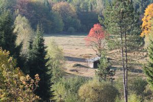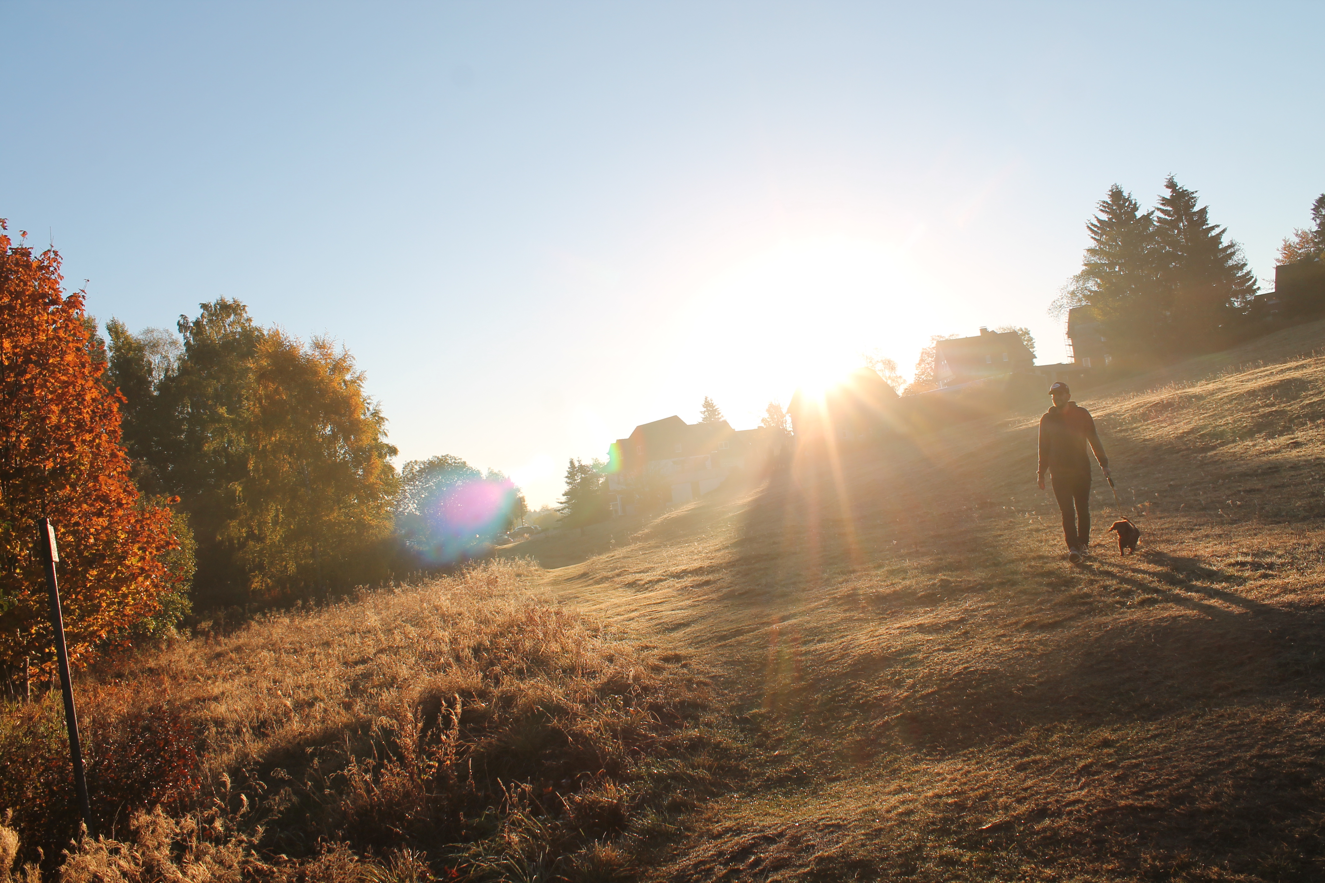 Am nächsten Morgen treibt es mich mit dem Hund auf die angrenzenden Bergwiesen. Fast wie in einem Gemälde von Caspar-David Friedrich wandere ich durch Nebelfelder, die zusammen mit den ersten