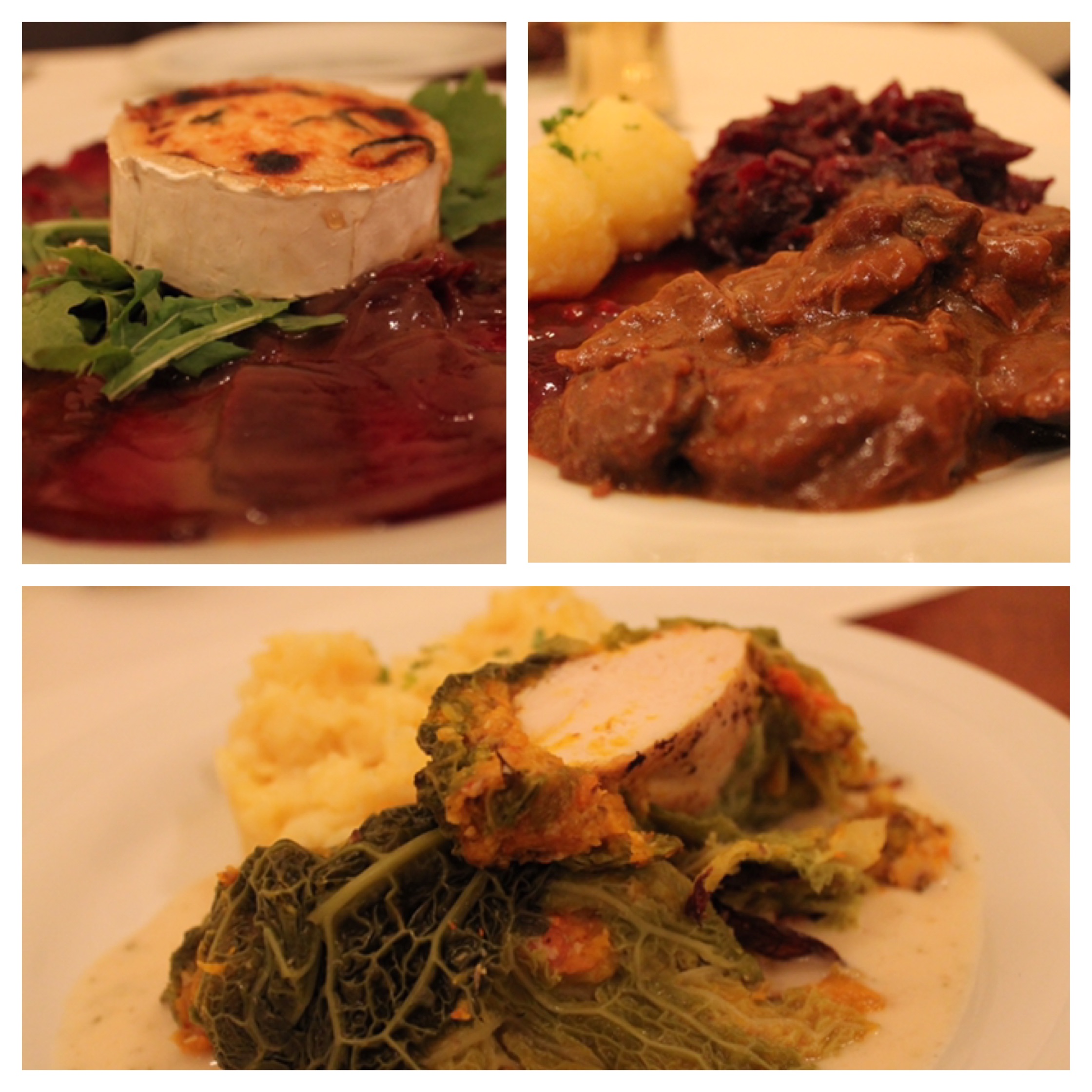 immer ein wenig skeptisch gegenüberstehe, läuft mir bei dieser Kreation regelrecht das Wasser im Mund zusammen. Unsere Augen touchieren beim Warten auf den Hauptgang die alten Fotos des Gebäudes an den Wänden. Mir schiessen gleich wieder Opas Erinnerungen durch den Kopf und sind Thema bis uns die satt gefüllten Teller des nächsten Gangs erreichen. „Hühnerbrust mit Kürbis-Pilz-Füllung im Wirsingmantel“ und „Wildragout mit Waldpilzen Rotkohl und Kartoffelklößen“ sehen icht nur lecker aus, sondern erfreuen unsere Gaumen maximal. Schmackhaft zusammengestellt und wirklich reichlich, überzeugt das Essen auf voller Linie. Die Anwesenheit eines Hundes am Nachbartisch macht deutlich hier sind die Vierbeiner gern gesehene Gäste. Ein schöner Fakt wie wir finden und eine gute Info für