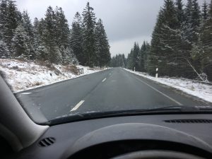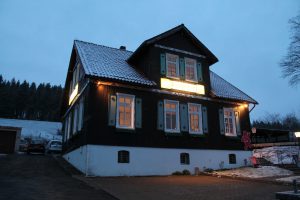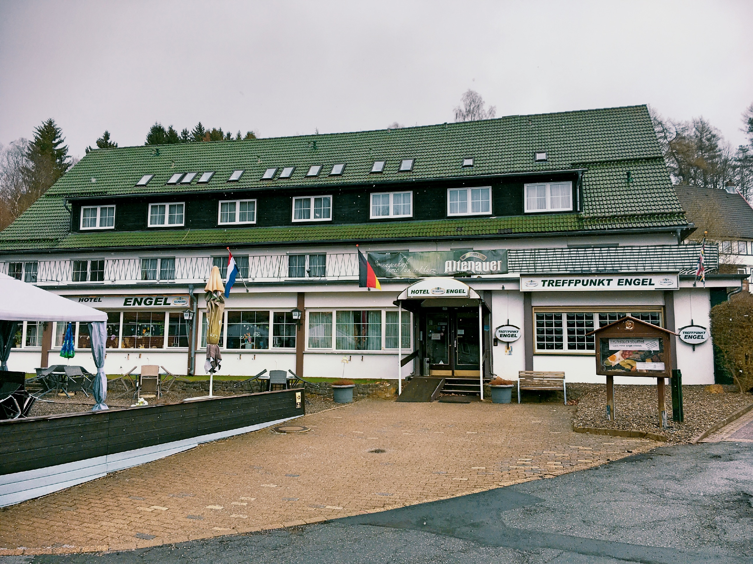 Aufgrund des guten Wetters der vergangenen Tage starten wir an diesem Freitag bei einsetzendem Schnee mit Sommerreifen in diesen Familienurlaub. Ein wenig mulmig ist mir schon, als wir die Bergpässe des Mittelgebirges befahren. Dank des hohen Gewichts unseres Gespanns mit fünf Personen, reichlich Gepäck und einem Dackel erreichen wir dann doch unser romantisch gelegenes Ziel in dem 1.850 Einwohner Kurort: Das Hotel Engel am Rande des Harzer Hexen-Stiegs. Familie Abels, die Betreiber der 2013 renovierten