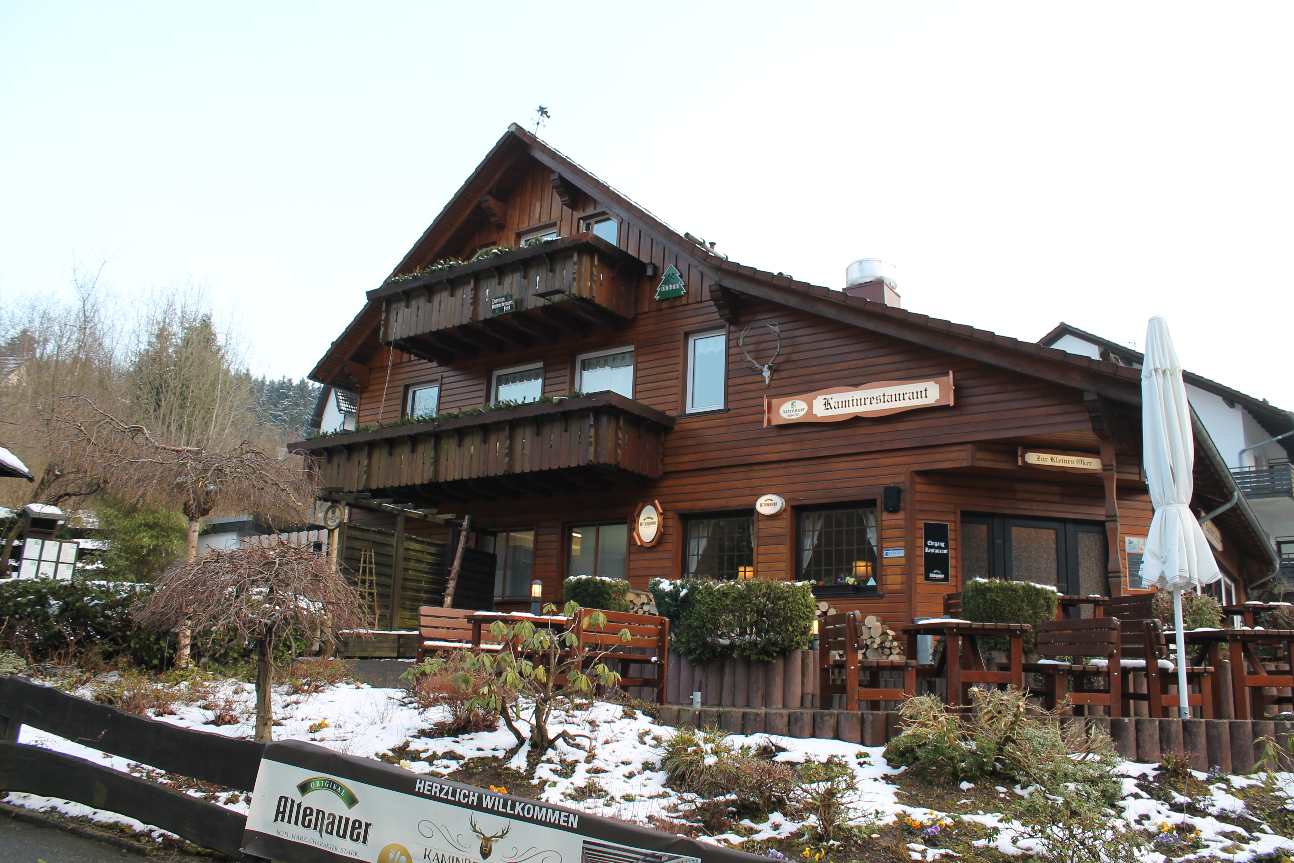 gehen wir einem Tipp meiner Mutter nach. Das Kaminrestaurant „Kleine Oker“ soll das Beste in Altenau sein. Wir wollen uns davon überzeugen uns kehren in das schön gelegene Lokal der Bergstadt ein. Das Glück ist uns mit einem Platz direkt vor dem warmen Kamin hold. Die Einrichtung ist rustikal, wunderbar harztypisch und somit sehr einladend. Familie Vock, die Inhaber dieser Traditionsgaststätte