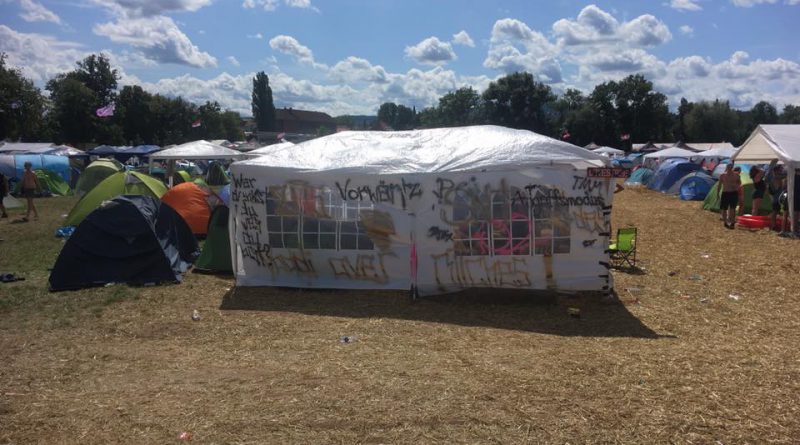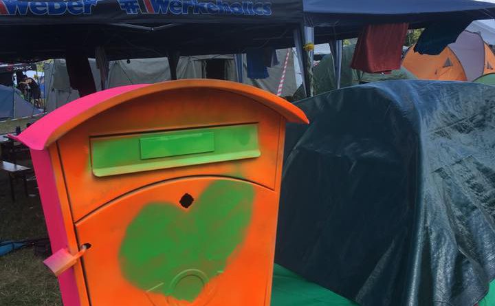 Sprüche wie diese gibt es viele auf dem Campingplatz des Open Flair Festival. Der zweite Tag beginnt für mich genau hier. Ich möchte sehen wie die Festivalgänger leben und bin wie jedes Jahr aus neue entzückt welche Phantasie hier an den Tag gelegt wird. Ganze Wohnzimmer werden angekarrt und sogar ein eigener Briefkasten vor dem Zelt angebracht. Man macht es sich halt gemütlich und will auffallen. Einfach nur campen kann ja jeder. Danach bummele ich noch ein wenig durch die Altstadt und bin recht angetan. Gerade die versteckten Gassen und Hinterhöfe sind es die überall kleine Schätze und Kunstwerke beherbergen. Eschwege ich mag Dich! Auf der Hofbühne musizieren derweil die jungen Herren von „North West“. Die Musik ist gut, nur der Gesang kommt zeitweise ein wenig schräg daher. Aber es muss auch nicht immer perfekt sein. Schön, dass hier auch solch jungen Kreativen eine Bühne geboten wird. Um 14:00 beginnt wie immer am Donnerstag die Eröffnungsshow im E-Werk. Felix Römer interviewt Gäste und diverse Künstler bereichern diesen herrlichen Auftakt. Auch die ältere Dame zu meiner linken, die mir ihre Lebensgeschichte aufdrückt vermag es nicht mich an dieser Show zu ergötzen. Eine Kultveranstaltung, die man einfach erleben muss. Erleben muss man auch die Band „The Intersphere“. Die Jungs aus Mannheim ziehen mich sofort in ihren Bann. Musik, die berührt und mich fast ein paar Tränchen vergießen lässt. Einfach nur schön! Ein Abstecher zu Helmut muss sein. Man lacht, erzählt Unsinn und freut sich einfach hier zu sein. Irgendwie werde ich müde und ziehe während die Donots die Seebühne entern von Dannen. Die Kilometer in den Beinen und ein paar Dirty Nörthy machen müde. Morgen gehts weiter mein Flair!