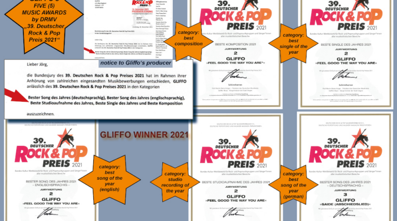 Über eine fünffache Auszeichnung beim 39. Deutschen Rock & Pop Preis 2021 durfte sich der in Bayern beheimatete Musik-Newcomer Gliffo (Rock/Pop) freuen. Der Künstler mit der markanten, sonorigen Stimme wurde bei dem von Deutschen Rock & Pop Musiker Verband (DRMV) initiierten Wettbewerb für die beiden Musiktitel „Saide (Abschiedslied)“ und „Feel Good The Way You Are“ in folgenden Kategorien mit jeweils einer eigenen Urkunde geehrt: