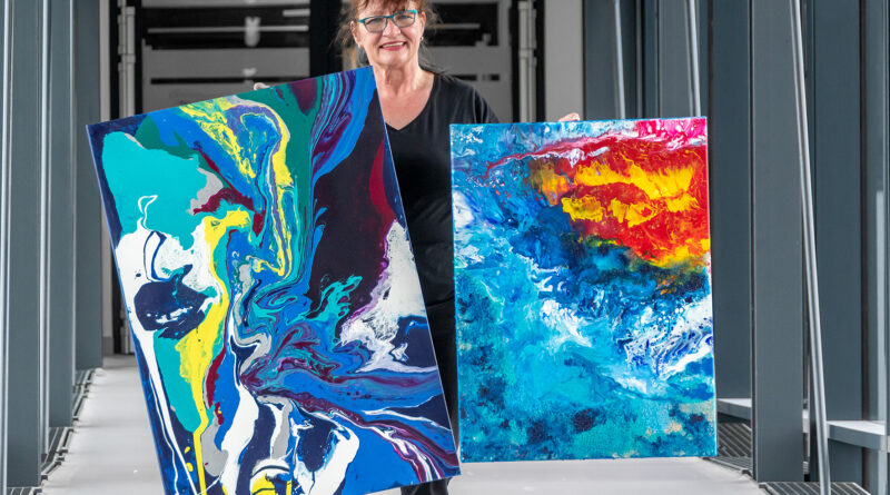 Ihre Leidenschaft zur Malerei hat die 63-Jährige schon früh während ihrer Ausbildung zur Schauwerbegestalterin entdeckt. So richtig losgelegt hat sie aber erst 2017 mit ihrem künstlerischen Schaffen. Seitdem probiert sie begeistert immer wieder neue Techniken aus und kombiniert diese – autodidaktisch und ganz unkonventionell. Sie verwendet unterschiedlichste Materialien wie Tinte, Kohle, Kreide, Sand, Acryl, Lack und Glitzer. Auch Hilfsmittel wie Spachtel, Brenner und Alkohol kommen bei ihr zu Einsatz, wenn sie besondere Effekte wie Bewegung, Verläufe, Zellen oder weich fließende Pastellfarben erreichen will. „Ich lege mich ungern auf eine Sache fest und suche gern neue Inspirationen“, sagt Petra Bock und kam so auch zur sogenannten Pouring-Technik, mit der sie auch Schallplatten in stylische Wanduhren verwandelt.
