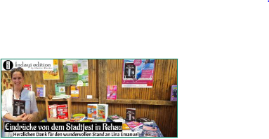 Am 2.Juli hieß es wieder “Rehau erleben” in der Innenstadt von Rehau, einer Stadt in Oberfranken. Das Stadtfest Rehau konnte nach der Corona-Pause endlich wieder stattfinden. Mittendrin befand sich unsere Autorin Lina Emanuel mit einem Stand unserer Bücher.