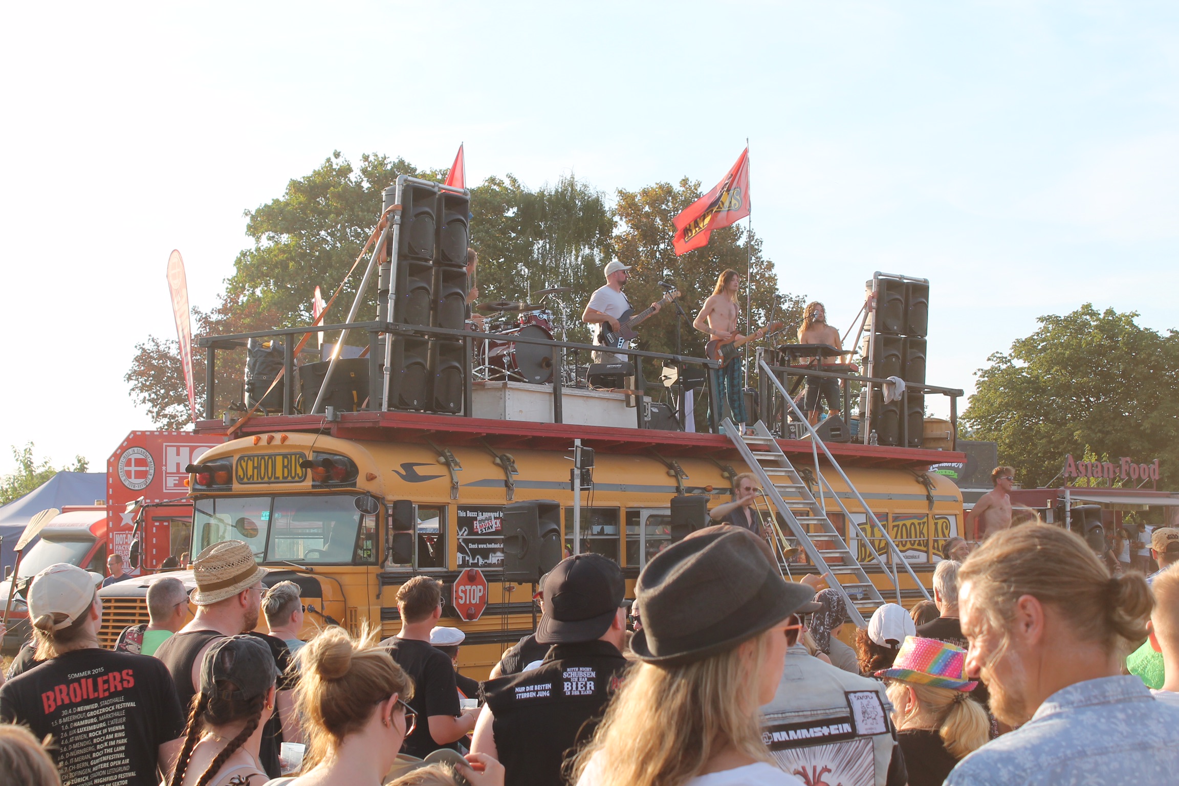 großen Box und Ballermann Hits unsere Unterhaltungen über Stunden erschweren, trüben diese Stimmung ein wenig. Als wir die See-Bühne für die Band Boppin‘ B ansteuern wird unser Trödeln bestraft. Leider bekommen wir nur noch die letzten zwei Songs der Rockn‘ Roller zu hören, werden aber mit den Bazzookas aus den Niederlanden, einer Hippie Ska Band, reichlich entschädigt. Man meint direkt nach Woodstock gebeamt worden zu sein und kann sich dem Rhythmus dieser außergewöhnlichen Band, die auf einem amerikanischen Schulbus auftritt, kaum entziehen.