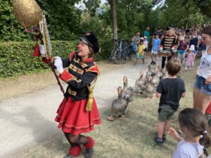 Das war’s wieder mal, mein Flair! Du hast mich emotional erwischt und das nicht zu knapp. Aber fangen wir von Vorne an. Heute sind wir früh im Schlosspark. Kinderbespassung und Schatten unter den alten Bäumen gibt es hier satt. Grund genug mit einer Decke und ein wenig Proviant uns hier niederzulassen. In der Nachbarschaft ruhen sich die Gänse aus und bereiten sich auf ihren nächsten Auftritt als Gänsekapelle vor. Die vielen Spielmöglichkeiten, das Puppentheater im Kleinkunstzelt und Herr Müller mit der Gitarre versüßen den