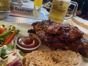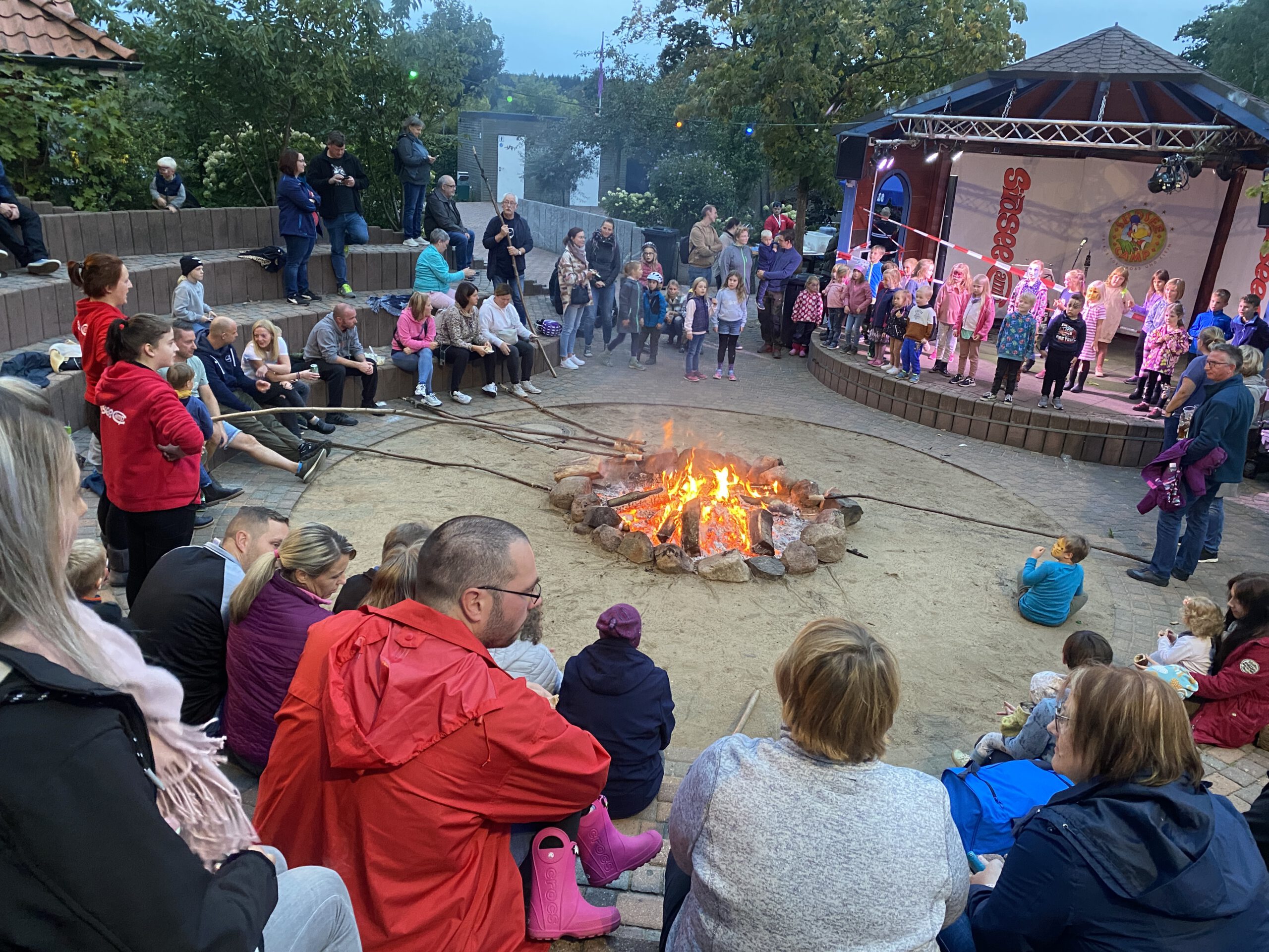 zumal uns in diesem Jahr drei Stunden vergönnt sind und nicht wie im letzten Corona-Jahr nur zwei. Einer der herrlichsten Momente für mich ist es immer in dem Outdoor-Becken von oben herab auf den Campingplatz zu blicken und in die Sonne zu blinzeln, die es an diesem Freitag sehr gut mit uns meint. Ich mag es einfach hier zu sein! Ein paar chillige Stunden später geht es zum traditionellen Essen in den Bootsmann. Das kleine Restaurant um die Ecke hat nach einem Jahr Spare-Ribs-satt-Pause diese Leckerei wieder im Programm. Ein Kultfaktor, der zurückgekehrt ist und uns dicke Bäuche sowie jede Menge Zufriedenheit beschert. Was vielleicht zwei Wochen vorher im Festzelt passiert wäre, findet heute im Amphitheater am See statt. Kinderanimation mit Stockbrotgrillen und Live-Musik. Ida ist begeistert und kann sich kaum auf dem Platz halten. Bei dem tollen Wetter ist das hier Draußen auch