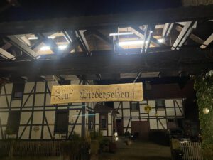 Im Dunkel des Abends leuchten uns die Schilder des Hotels den Weg in die Gaststube. Wir werden