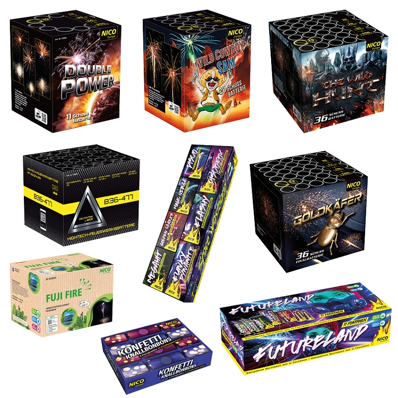 Dieses Jahr können sich Kunden auf zwei neue große Batterien im NICO Sortiment freuen. Die Delta Fire B36-77 mit 36 Schuss, die wechselnd geschossen werden und mit goldenen Feuertöpfen und Leuchtsternen aufsteigen. Anschließend verwandelt sich der Effekt zu Brokat-Kronen, Time-Rain-Effekten, farbigen Blinksternen oder umherschwirrenden Stern-Würmern. Das Finale der Batterie begeistert mit einer Wand aus Gold-Chrysanthemen-Effekten.