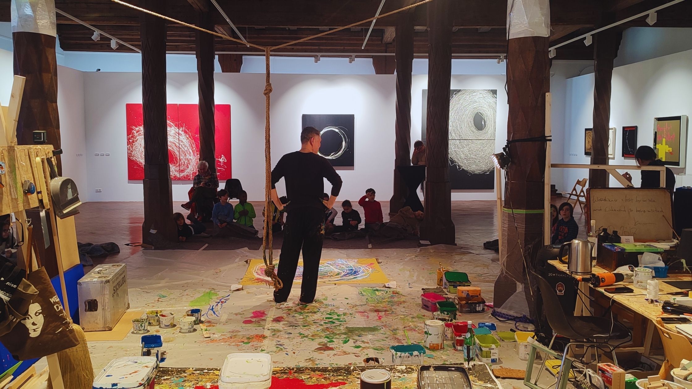 Kiichiro präsentiert seine Werke nicht nur, sondern malt live vor den Augen der BesucherInnen, um sie so auf authentische Weise in seine Welt entführen zu können. Betrachtende werden dabei zu seiner Inspiration. Welche eindrucksvollen Ergebnisse diese außergewöhnliche Interaktion mit dem Publikum hervorbringen kann, beweist das große Bild, das im Zusammenwirken mit den Kindern der Giraffenklasse der Martin-Schaffner-Grundschule Ulm entstanden ist. „Das haben wir gemacht, mit Herz und Gedanken“, sagt Lehrerin Frau K. Schönberger. Von Regenbogenbombe über explodierte Tomaten bis hin zu „von einem Hochhaus ein Ei werfen“ – die Ideengeber für dieses eindrucksvolle Kunstwerk waren die Kinder selbst und Kiichiro setzte es auf seine einzigartige Weise vor den Augen der SchülerInnen um. Entsprechend groß war die Freude der Kids, als Künstler und Kurator das Werk eine Woche nach Ausstellungsende mit einem ausgedienten Feuerwehrfahrzeug in die Schule lieferten. Die Kraft er Kinder, die aus den unterschiedlichsten Nationen stammen, ist in diesem Werk festgehalten. Einmal hat die Kunst bewiesen, dass sie keinen Unterschied macht, sondern jeden annimmt, wie er oder sie ist.