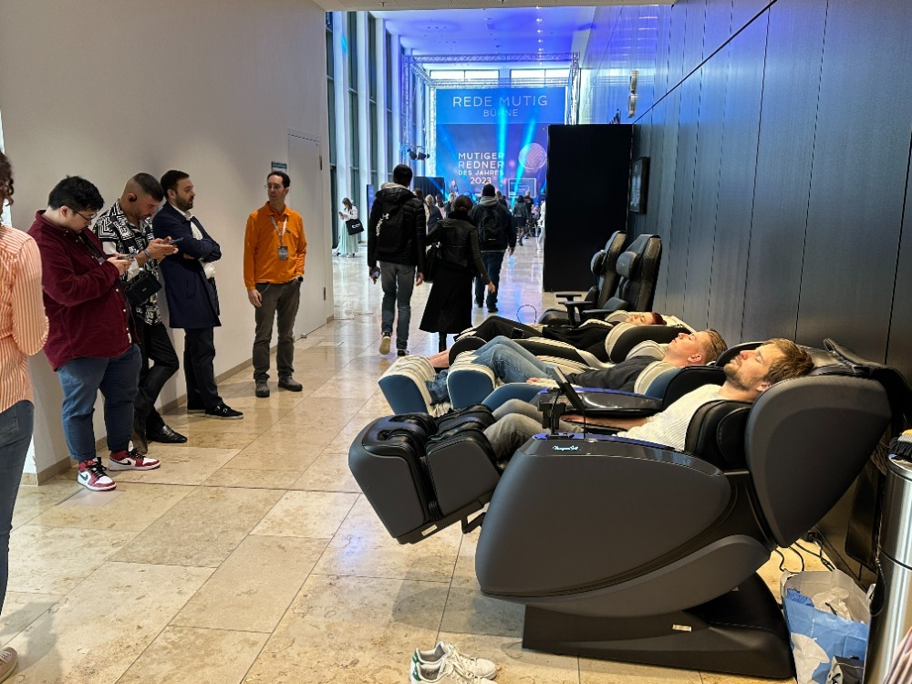 Es besteht ein klarer Trend hin zu Großveranstaltungen, die auch Wellness- und Gesundheitsangebote wie Yoga, Meditation und Massagen anbieten. Denn laute Musik, Menschenmassen und intensive Eindrücke hinterlassen ihre Spuren. Gerade bei älteren Besuchenden sind die Angebote der Wohlfühloasen beliebt. Sie sind Orte der Ruhe und Erholung, in denen man sich vom Trubel zurückziehen und entspannen kann. Michael Roedeske, Gründer von Massagesessel Welt, sieht den positiven Effekt von Wohlfühloasen auf Großveranstaltungen immer wieder. „Mit unserem Kurzzeit-Mietmodell für Massagesessel unterstützen wir Veranstalter, ihren Teilnehmenden körperliche und geistige Entspannung zu bieten. Gerade in diesem Jahr ist die Nachfrage enorm hoch“, so der Entspannungsexperte. Regelmäßig fragen Veranstalter an, um seine Sessel in ihre Erholungs-Lounges zu integrieren. Zuletzt war Massagesessel Welt mit drei Modellen auf dem zweiten Avalanche-Summit in Barcelona im sogenannten Recharge Garden: „Unsere Sessel kamen überragend an, mit teils langen Warteschlangen von mindestens 15 Leuten.“ Die hohe Nachfrage einerseits sowie das steigende Bewusstsein für Gesundheit und Wohlbefinden andererseits werden dazu führen, so Michael Roedeske, dass Wohlfühloasen auf Festivals und Konferenzen in Zukunft nicht mehr wegzudenken sind.