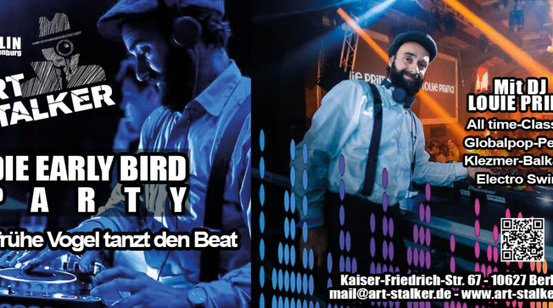 Passend zur künstlerisch farbenfrohen Ambiente serviert der musikalische Schatzsucher DJ Louie Prima neben feinsten All time-Classics auch Klezmer-Balkan & Electro Swing und Globalpop-Perlen und verführt zur Tanz-Ekstase. Enjoy!