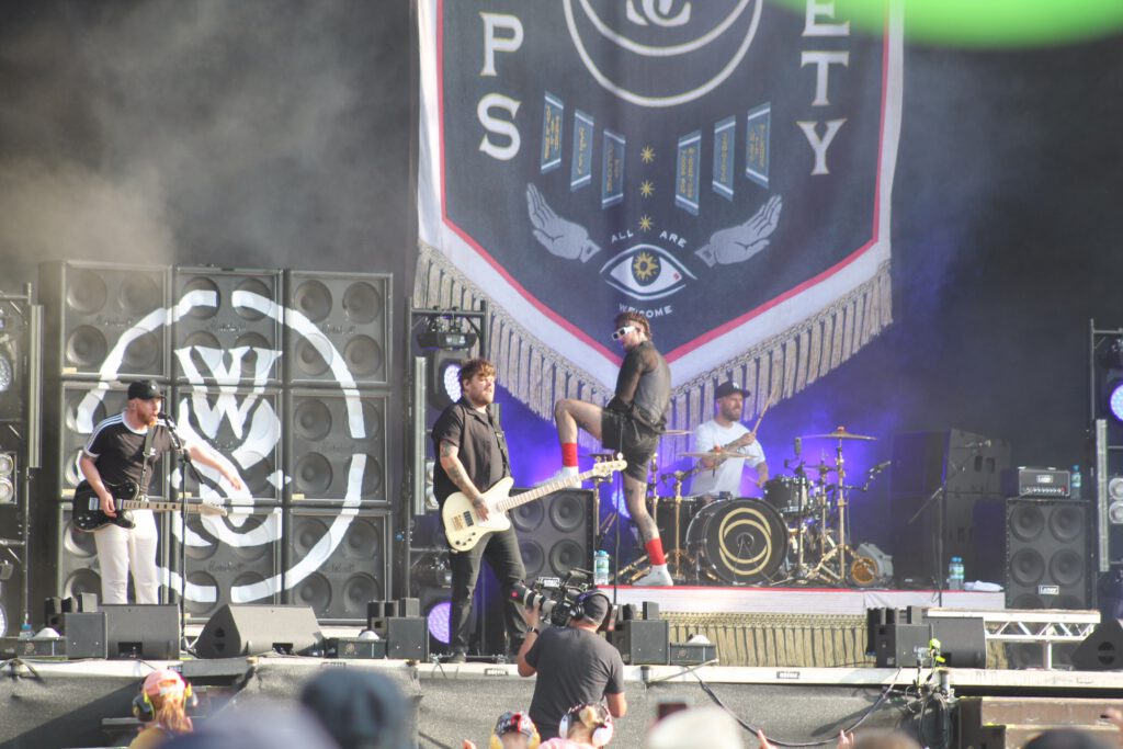 geht. Vereint mit Frau und Kind soll es gleich wieder zurück auf das Werdchen gehen. Ein kurzer Besuch auf der großen Spielwiese, deren Attraktionen meine Tochter schüchternerweise noch nicht ganz so annehmen will, dann lauschen wir gemeinsam der ersten Formation namens „Plume“. Das Münchner Quintett geht ab wie die berühmte Katze von Schmidts. Elemente aus Rock, Elektronik und Pop, ja bis zum Metalcore sind in der Musik auszumachen. Noch schnell ein Stück Pizza für das Kind und Ente asiatischer Art für die Eltern vom Stand neben an, schon legen „While She Sleeps“ los. Bereits im Livestream von Wacken bewundert, können die Jungs auch