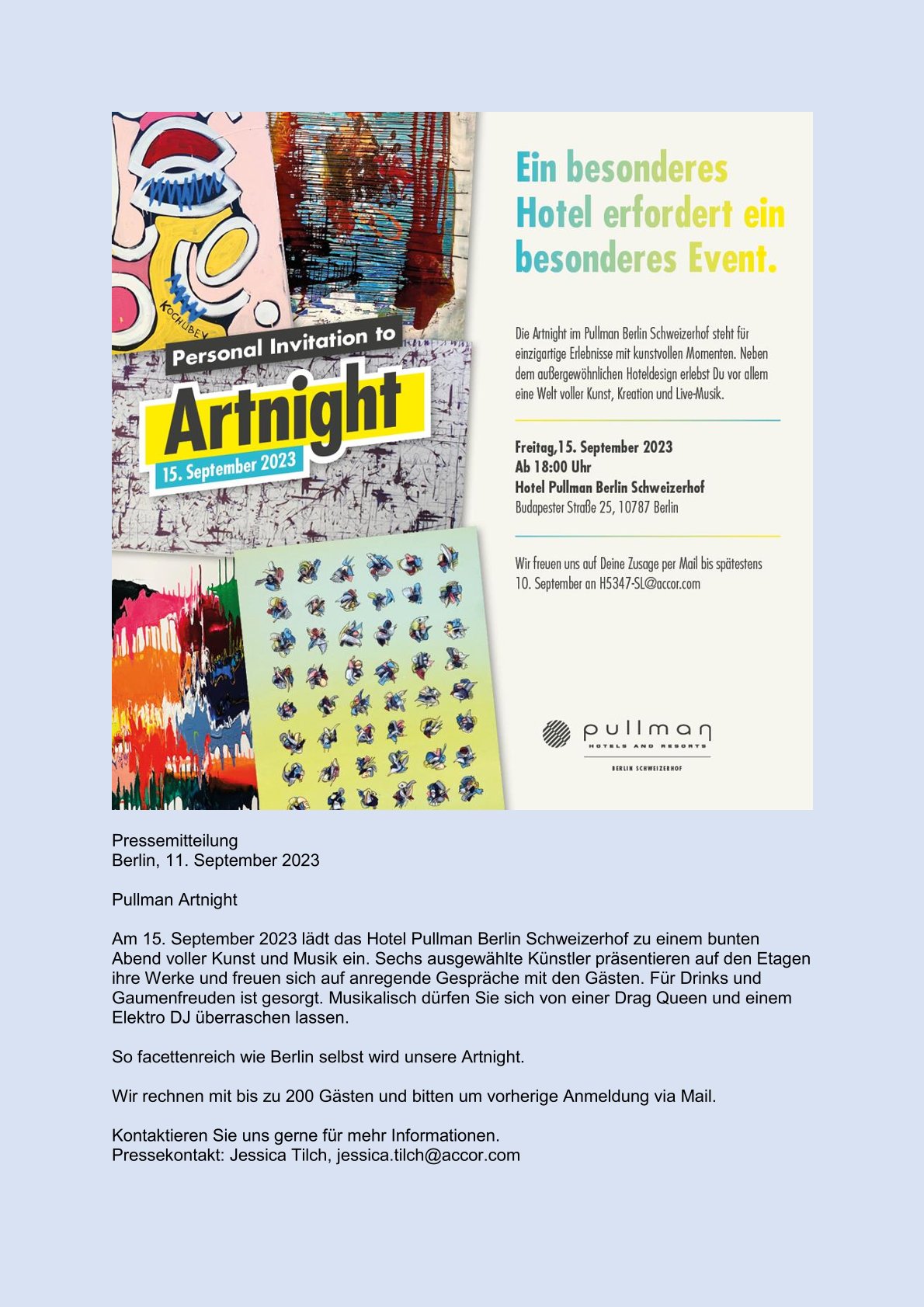 Am 15. September 2023 lädt das Hotel Pullman Berlin Schweizerhof zu einem bunten Abend voller Kunst und Musik ein. Sechs ausgewählte Künstler präsentieren auf den Etagen ihre Werke und freuen sich auf anregende Gespräche mit den Gästen. Keiner gleicht dem anderen, ebenso ihre Kunst.