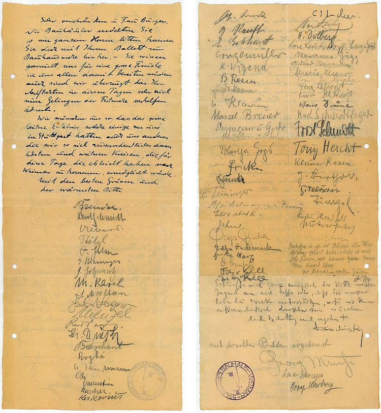 Dabei handelt es sich um eine Bittschrift, unterzeichnet von den Bauhausmeistern Paul Klee, Wassily Kandinsky, Georg Muche, Lothar Schreyer und Josef Hartwig sowie rund 65 Bauhausstudentinnen und -studenten (darunter Josef Albers, Gunta Stölzl, Herbert Bayer, Ida Kerkovius, Marcel Breuer, Otto Umbehr und Paul Citroen). Die Bauhäusler baten darin das Stuttgarter Tänzerpaar Albert Burger und Elsa Hötzel „so von ganzem Herzen“ darum, mit ihrem Triadischen Ballett (von dem „wir so viel Außerordentliches hörten“) zur Bauhauswoche 1923 nach Weimar zu kommen. Frank-Manuel Peter hatte in seiner Publikation noch die Unauffindbarkeit dieses Originals beklagt, welches in der Kölner Sammlung bislang nur als historische Fotokopie von schlechter Qualität vorlag. Bei dem Schriftstück handelt es sich nicht nur um die wohl vollständigste Autographensammlung des frühen Bauhauses, sondern auch um ein zentrales Dokument zur Geschichte des modernen Tanzes. Die engagierte Einladung hatte nämlich Erfolg und so fand am 16. August 1923 die zweite und wirkungsvollere Aufführung des Stückes statt.
