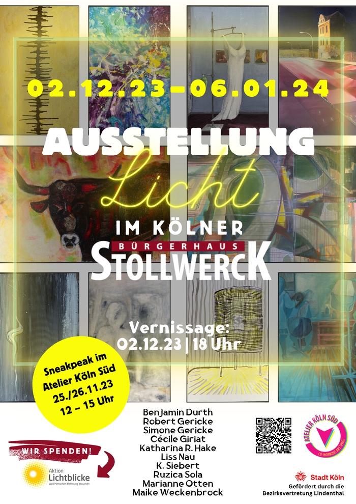 LICHT ist unser Lebenselixier – ohne Licht gäbe es kein Leben, keine Energie, keine Wärme! Licht macht uns frohgemut, lässt uns lächeln, und – Licht lässt uns Farben erkennen! Dem Farbenrausch hingegeben haben sich die Künstler*innen des Atelier Köln Süd und zwei Gastkünstler*innen aus Berlin. Bei der Gruppenausstellung LICHT, vom 02. Dezember 2023 bis 06. Januar 2024, präsentieren sie im Kölner Bürgerhaus STOLLWERCK ihre zeitgenössischen Werke: