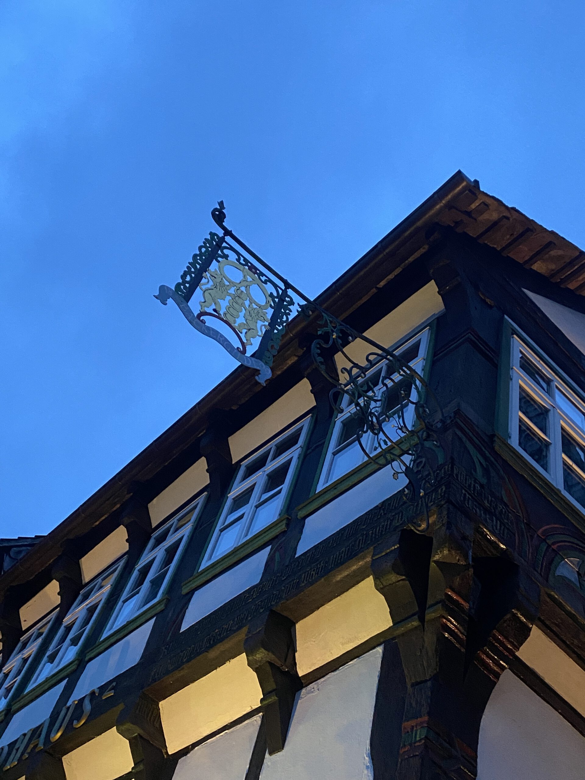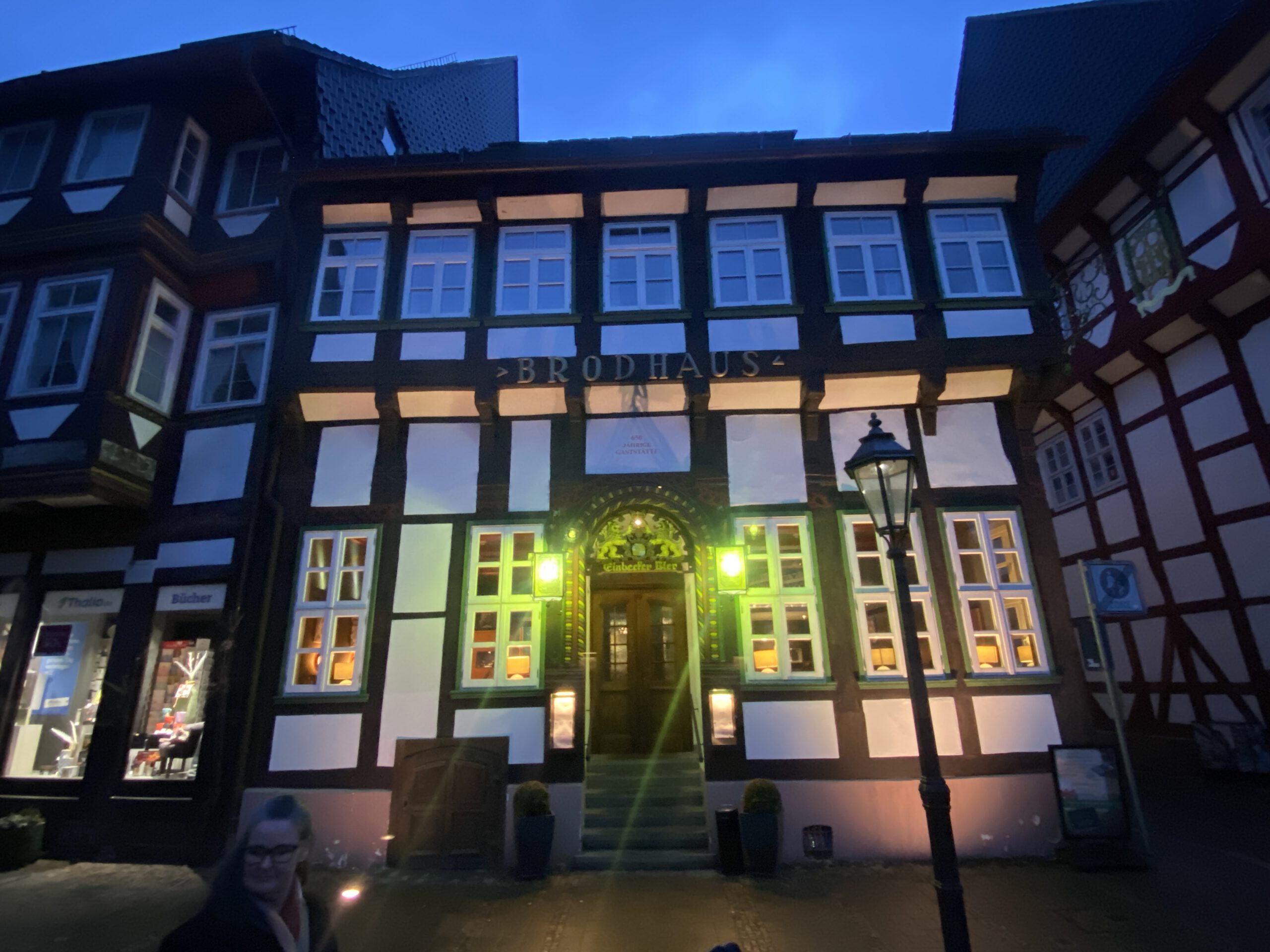 Anfang Februar nimmt zwar die Länge der Tage wieder zu, doch um 17:00 Uhr ist dennoch so dunkel, dass man die schönen Fachwerkhäuser in der ehemaligen Hansestadt Einbeck nur noch halb so gut betrachten kann. Schade, aber nicht ganz so wild, denn wir werden gleich ein echtes Prachtexemplar dieser Zeitzeugen von Innen bewundern dürfen. Das Brodhaus in Einbeck ist unsere