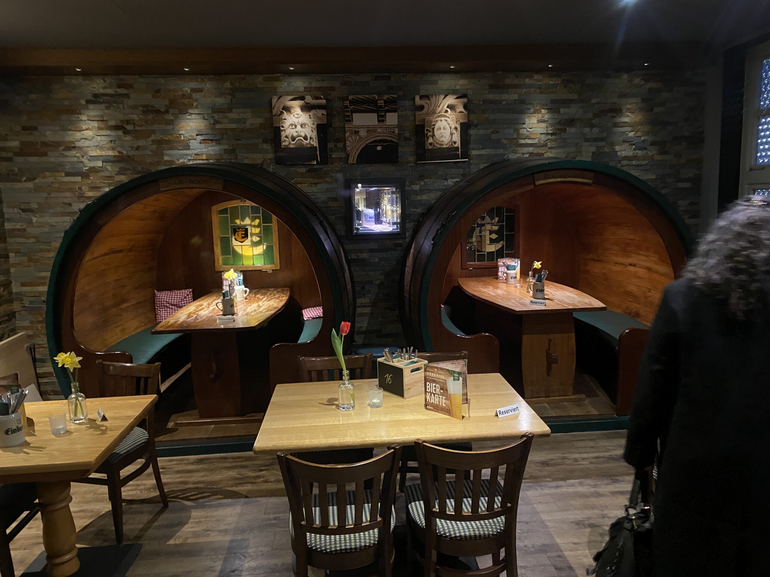 die Hilfen für den Wiederaufbau des Hauses im Jahr 1552 genau verzeichnet. 1552, das Jahr in dem das Brodhaus auch zum Gasthaus wurde und somit als eines der ältesten Wirtshäuser Niedersachsenes gilt. Die Verbindung zur Kirche besteht samt der einhergehenden Verpflichtungen genau genommen auch heute noch, wird aber schon lange nicht mehr abgerufen. Mit einer solchen Historie und der vielversprechenden Speisekarte betreten wir fast ehrfürchtig die Räumlichkeiten. Im vorderen Bereich modern und einladend eingerichtet führt uns die freundliche Servicekraft in das hintere „Abteil“. Hier wird es rustikaler, aber keineswegs ungemütlicher. Ganz im Gegenteil, denn grosse Fässer die zu Sitzgelegenheiten umfunktioniert wurden