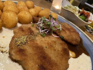 Abend als auf die regionalen Köstlichkeiten selbst zu setzen. Ein Plan der vollends aufgeht. Als das Essen unseren Tisch erreicht können wir es kaum erwarten diesem Genuss hinzugeben. Das saftige Schnitzel aus dem Jungschweinrücken kommt mit einer leckeren, hausgemachten Einbecker Senf Soße, die aus dem traditionellen Senf der Einbecker Senfmühle gemacht wurde, inklusive Kroketten und Beilagensalat, daher.