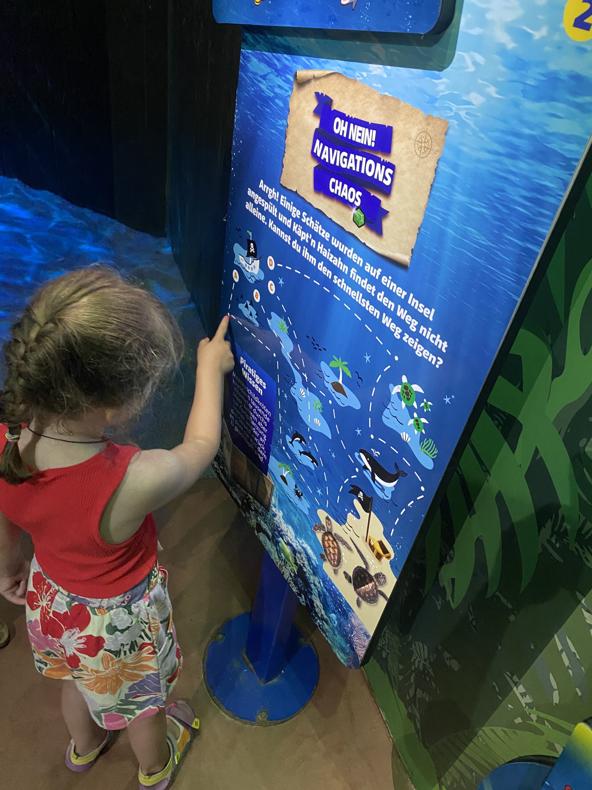 Da die Online-Eintrittkarten auf eine bestimmte Uhrzeit gebucht wurden, wird für uns der ca. 10 Min. Gehweg entfernte, empfohlene Parkplatz zum Startpunkt eines kleinen Dauerlaufs. Früher starten hätte ganz gut getan, aber im Urlaub ja immer so eine Sache. Leicht ausser Atem und angeschwitzt erreichen wir dann doch noch pünktlich das direkt am Meer gelegene Gebäude der Aquarienwelt. Freundlich begrüßt erhält unser Kind zunächst eine Piratenausrüstung inklusive Schatzkarte um die Fragen an verschiedenen Stationen innerhalb des Gebäudes zu beantworten und am Ende eine kleine Überraschung zu bekommen. Aufregend. Eine lange Treppe führt uns hinab in die atemberaubende Welt der Meere.