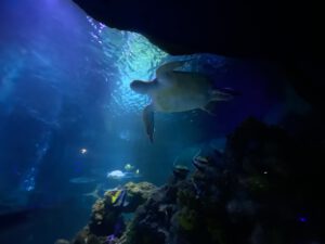 Von nun an kommen wir aus dem Staunen nicht mehr heraus, während die Kinder von Becken zu Becken laufen und dabei noch ihre Aufgaben des Parcours lösen, geniessen wir Erwachsene einfach nur die beruhigende, blaue Welt der Ozeane. 2.500 faszinierenden Tieren aus über 100 verschiedenen Arten gibt das Sea Life Timmendorfer Strand ein Zuhause. Haie, eine grüne Merresschildkröte, Doktorfische und die aisatischen Kurzkrallenotter sind nur einige Exemplare hier, die auf uns eine unbeschreibliche Faszination ausüben.