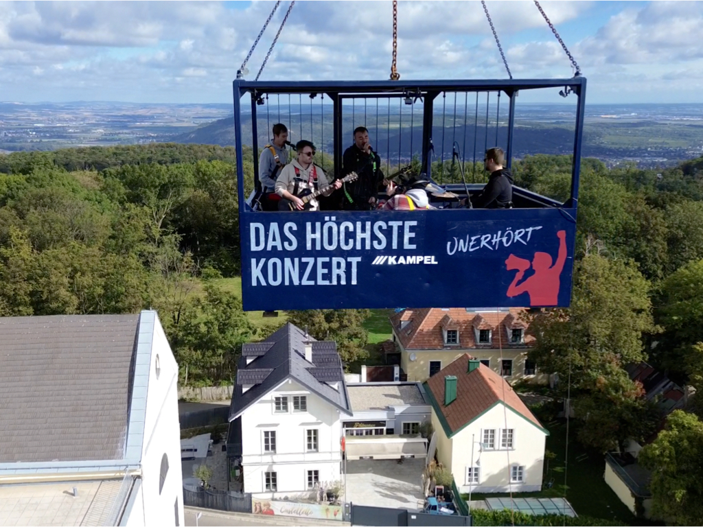 Mit tausenden YouTube und Spotify Aufrufen zählt die Band Unerhört zu den großen Senkrechtstartern der vergangenen Jahre in der heimischen Musikszene. Das einzige was noch fehlt ist die Aufnahme ins Radioprogramm. „Wir wollen dass uns ganz Wien hört und weil uns das Radio nicht spielt, nehmen wir das nun selbst in die Hand, denn wir sind Unerhört,“ so Lukas Toth Frontmann der Band. „Um sich in Österreich Gehör zu verschaffen, muss man uber seine Grenzen gehen. Wir durchbrechen heute den Höhenrekord mit dem höchsten Konzert Wiens auf hängender Kranbuhne von Kampel Kran – vielleicht hört uns ja jetzt die ein oder andere Radiostation.“