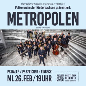 Der PS.SPEICHER und das „Polizeiorchester Niedersachsen“ veranstalten am 26. Februar 2025 um 19:00 Uhr ein Benefizkonzert in der PS.Halle in Einbeck. Der Einlass erfolgt ab 18:30 Uhr.