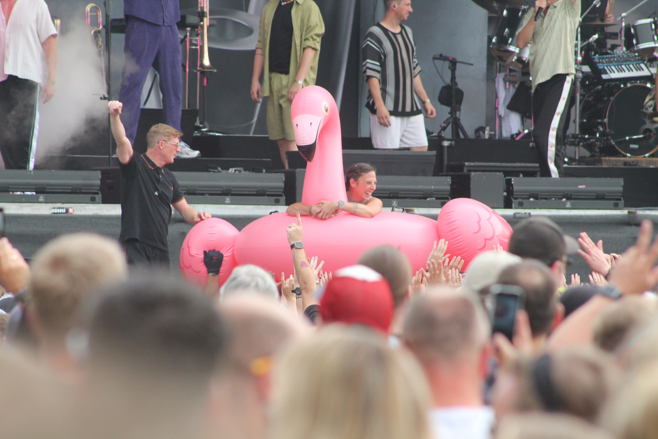 Kinder ihren ganz eigenen Spaß haben. Nebenan Serpentin mit ihrem finsteren Elektro-Sound und dann Querbeat. Ein Name der Programm ist, hier verschmelzen wohl die meisten Musikstile in einer Band auf dem Open Flair. Was für eine Party! Leider hält das Rennen von zwei aus dem Publikum ausgesuchten Fans auf Riesen-Gummi-Flamingos durch die Menge einen kleinen Schock-Moment parat. Vogelreiter Basti kann sich auf dem Gummigefährt nicht halten und fällt unglücklich durch die Menge. Die Band stoppt daraufhin solange die ihre Performance, bis Entwarnung von den Hilfskräften gegeben wird.