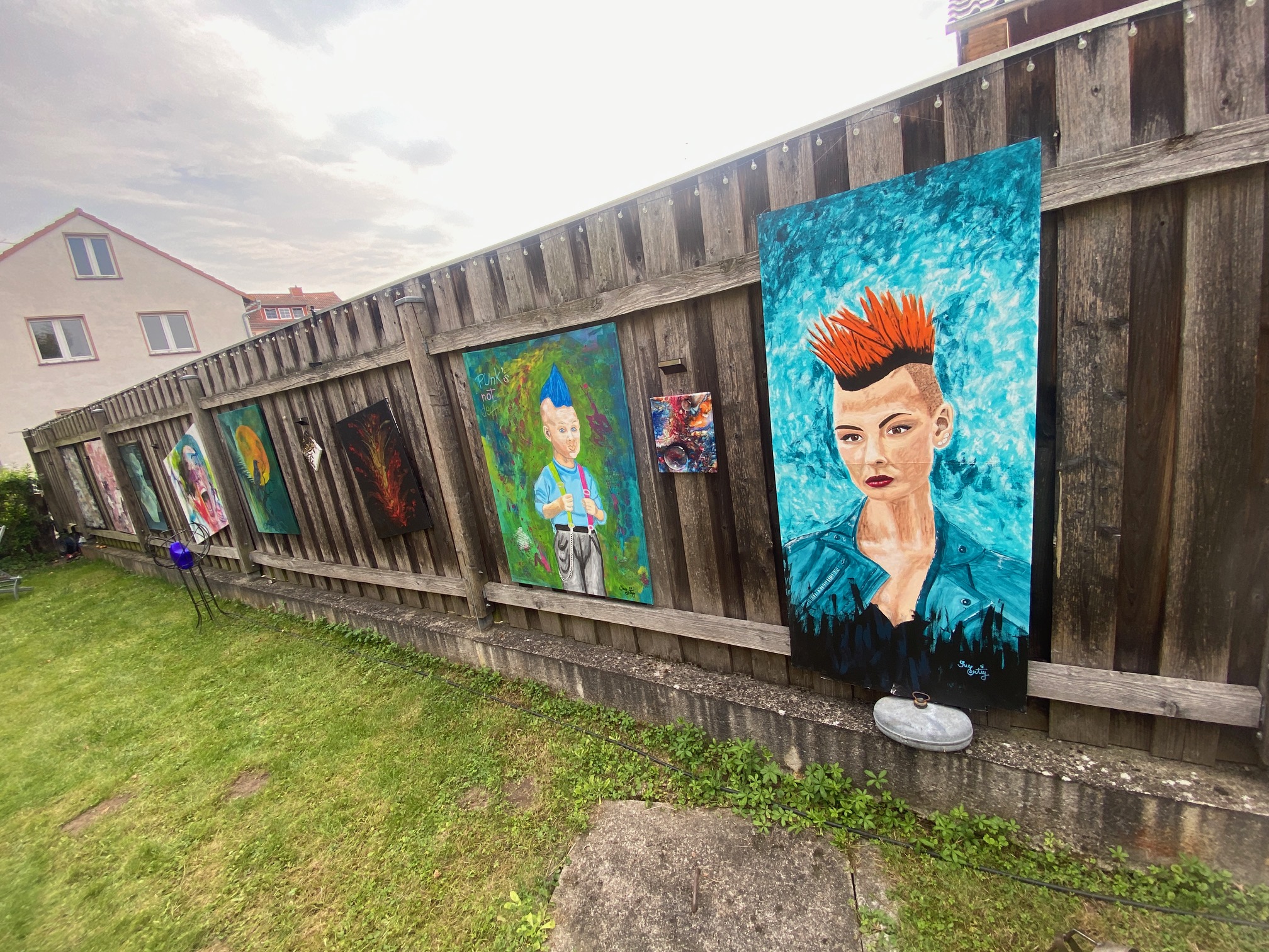 Gesundheit stejt eben noch vor ihm dem Partymachen. Auf unserem Streifzug durch die Stadt erblicken wir große Posaunen, die per Pedal angetrieben werden. Ein faszinierender Walk-Act, der sich wieder einmal perfekt in dieses Event einfügt. Auf einem Hinterhof entdecken wir zum ersten Mal verschiedene Aktionen des Vereins Seelenhaus aus Eschwege. Seifenblasenaktionen für Kinder, eine Ausstellung von Malereien am Gartenzaun und die Band KimKoi punkrocken dazu an