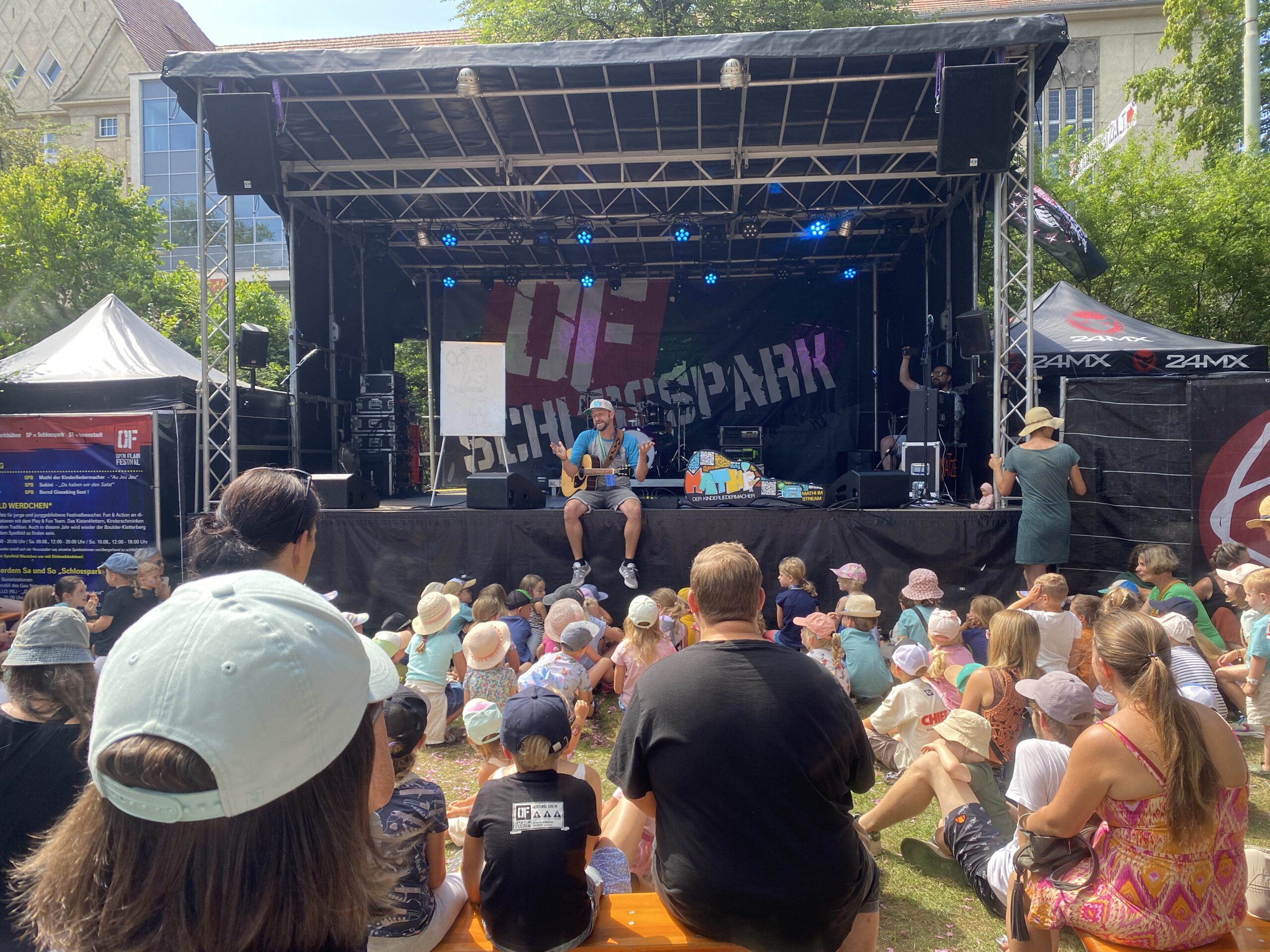Es ist wie es ist, am Sonntag steht das von uns erwählte Programm noch mehr im Zeichen der Familie als die Tage zuvor. Die Sachen für die Heimreise mit einem weinenden Auge verpackt, dann tingeln wir mit einem Lachenden zum Schlosspark – dem Walhalla für Kids und Junggebliebene. Klaro, noch einmal durch das Rätsellabyrinth, dem Escape Room für Kleine, dann Mathy den Kinderliedermacher lauschend am Bastelstand des Geo-Naturpark Frau Holle. Passend zum Natur-Thema können hier Traumfänger der besonderen Art gebastelt werden. Schön im Schatten auf einer Bank sitzend genau das richtige an diesem erneut sehr warmen Tag in der Eschweger Innenstadt.