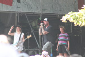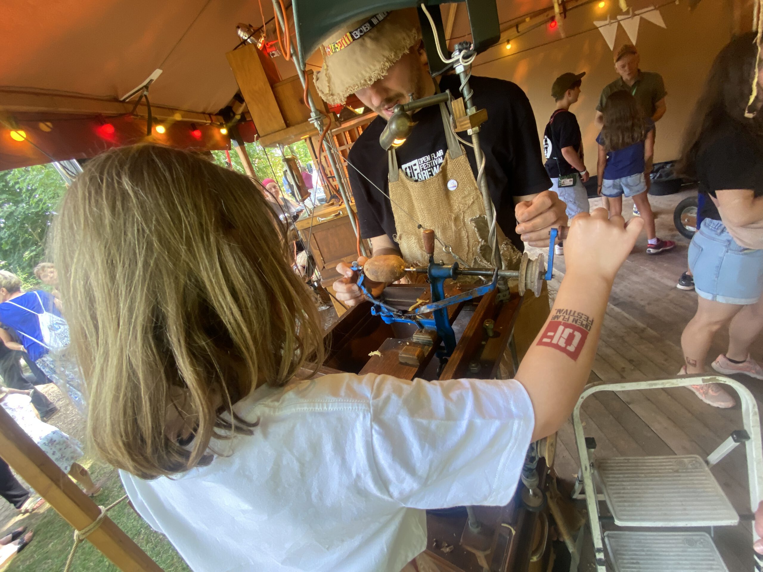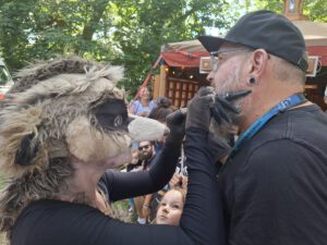 Mit viel Liebe zum Detail wird der Erdapfel in dieser besonderen Kulisse bearbeitet und am Ende fast schon erfurchtsvoll verspeist. Dabei schaut und das Kamel „Kamelita“ über die Schulter. Ein weiterer Walking Act der den jungen Flaries viel Freude bereitet. Auf dem Weg zu einem letzten Besuch auf dem Werdchen, ein kurzer Abstecher zur Hofbühne. Hier zieht die Band „False Lefty“ fast schon schamamenartig die Hörer in ihren Bann. Beeindruckender Sound den das Duo zu bieten hat. Wieder auf dem Weg treffe ich noch auf Andy Strauss.