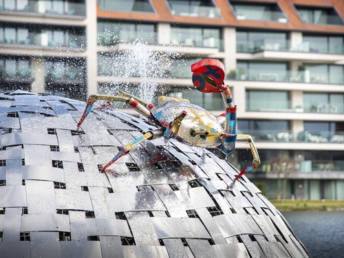 Eine Kommission aus internationalen Fachleuten hat im Jahr 2022 die Open-Air-Kunst in den verschiedenen Ortsteilen des belgischen Seebads inspiziert und bewertet. Eine Skulptur, auf die man am Zoutelaan stößt, hat nach Ansicht der Fachleute Weltklasse-Niveau. Es ist _Le Dragon_, der Drache von Niki de Saint Phalle. 15 weiteren Werken bescheinigte das Gremium Spitzenqualität. _Wuivende Krabben_, die winkenden Krebse, des belgisches Künstlers Panamarenko gehören dazu. Das Kunstwerk aus dem Jahr 2011 ist ein technisches Wasserballett und besteht aus drei schwimmenden Inseln. Diese sind aus schmalen Streifen aus hochglanzpoliertem Edelstahl gefertigt. Sechs farbenfrohe rote Krebse, ebenfalls aus rostfreiem Stahl, sitzen mit geöffneten Scheren auf den Inseln und wiegen sich im Wind. Das Ensemble, das von großen Schwimmpontons über Wasser gehalten wird, ist das größte Werk, das Panamarenko je realisiert hat.
