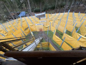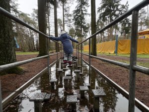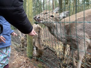 Aber entmutigen lassen wir uns trotzdem nicht und nehmen das was weiterhin erlebbar ist. Ein Gang durch den Märchnwald, in dem man bekannten Geschichten lauschen oder auch Rehe füttern kann macht einfach auch bei einer solchen Wetterlage Laune. Die Ziegen freuen sich ebenso über ein paar Streicheleinheiten wie der riesige Triceratops oder T-Rex auf der Dinosaurier-Insel. Der Irrgarten verlangt von uns als Familie echtes Teamwork ab, ebenso wie eine schnelle Runde auf Draisine. Am meisten Zeit verbringt der Nachwuchs die