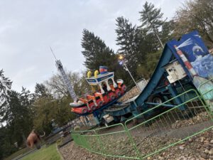 der sympathische Magier und weiss gekonnt zu unterhalten. Klasse Effekte auf kleiner Bühne faszinieren das anwesende Publikum sichtlich und entlocken am Ende der Vorstellung den Anwesenden einen kraftigen Applaus. Direkt neben an liegt die Indoor-Themenfahrt „Drachen-Magic“. Geisterbahnähnlich tauchen wir ein in die magische Welt des Drachen und Zauberer und lassen uns durchaus spassigerweise auch mal zu einer Schrecksekunde hinreissen. Ein echtes Highlight! Als der Regen langsam nachlässt versuchen wir unser Glück bei der Achterbahn, die leider wie viele andere Fahrgeschäfte auch bedingt durch die Nässe heute nicht mehr fahren wird.
